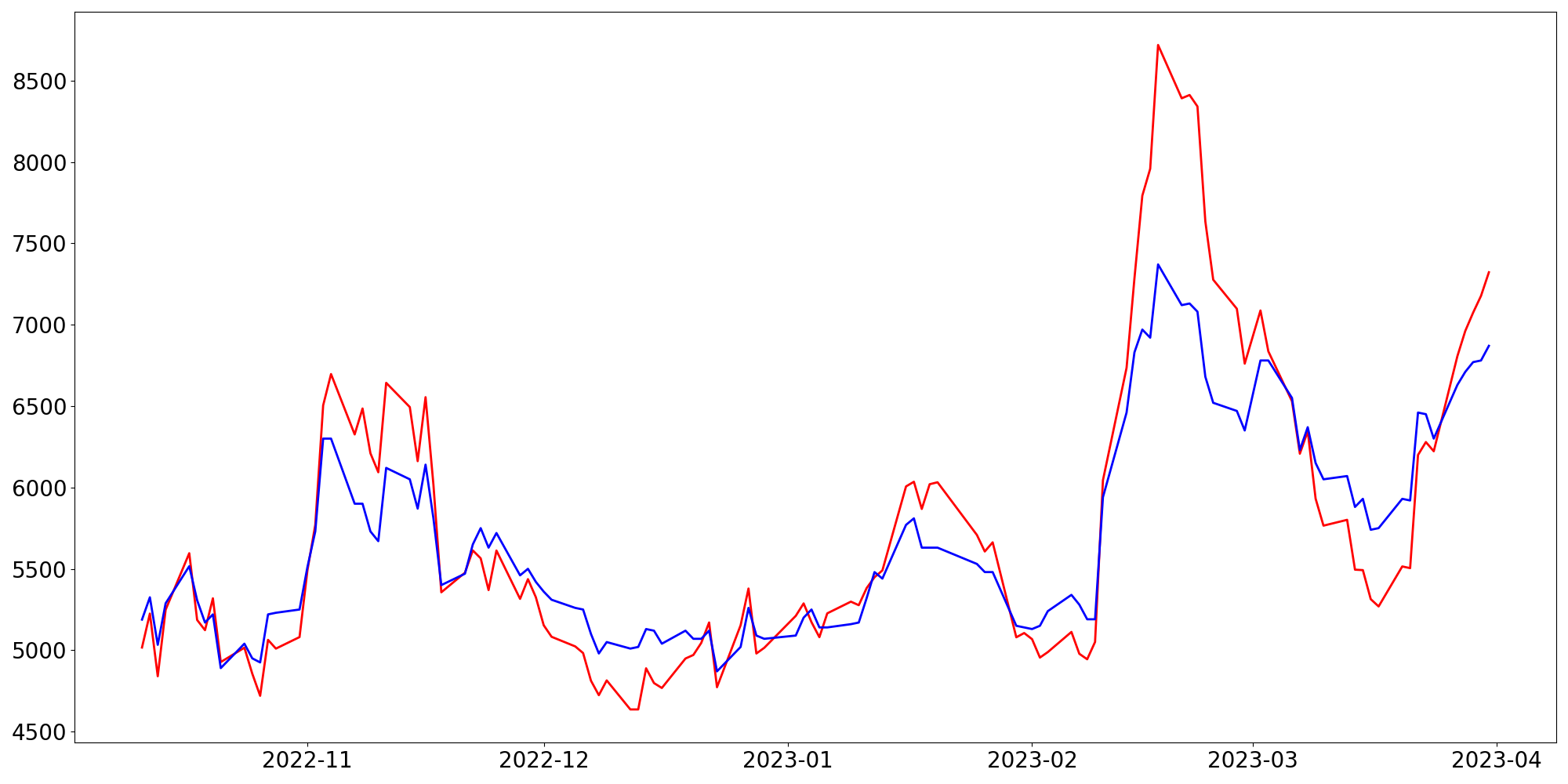 [ - : 실제값(종가) / - : 예측값(종가) ]