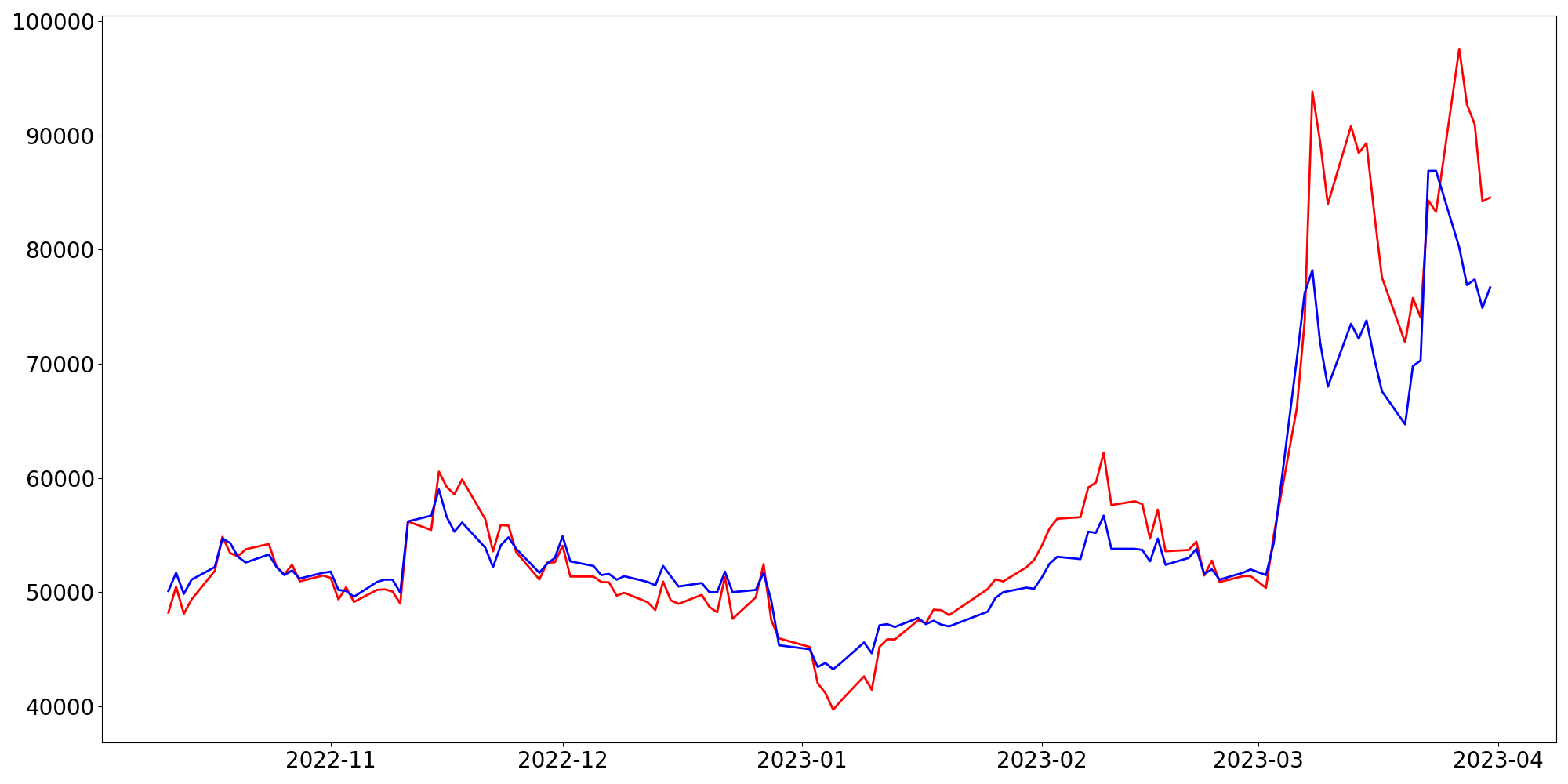 [ - : 실제값(종가) / - : 예측값(종가) ]