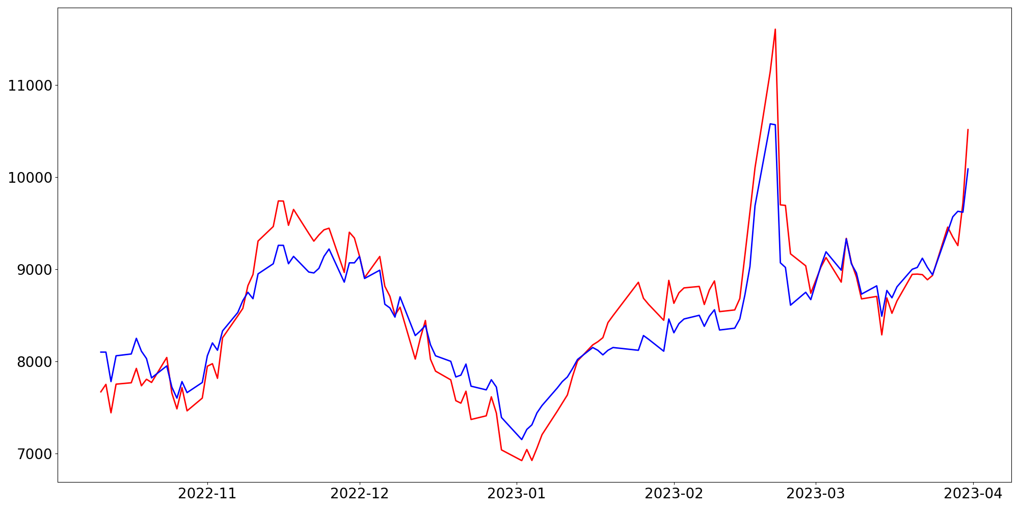 [ - : 실제값(종가) / - : 예측값(종가) ]