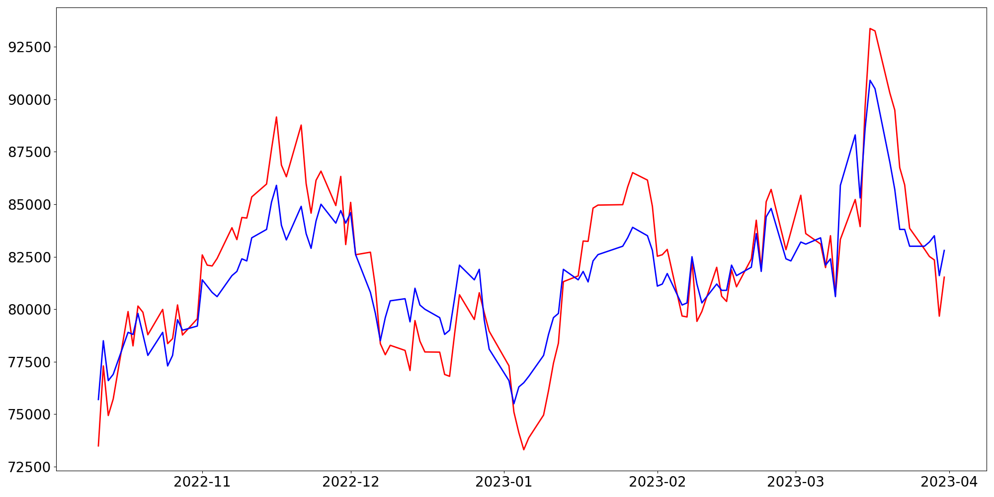 [ - : 실제값(종가) / - : 예측값(종가) ]