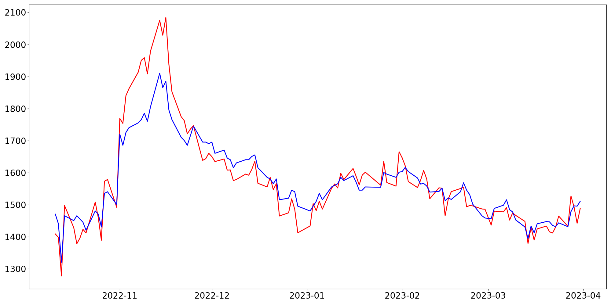 [ - : 실제값(종가) / - : 예측값(종가) ]