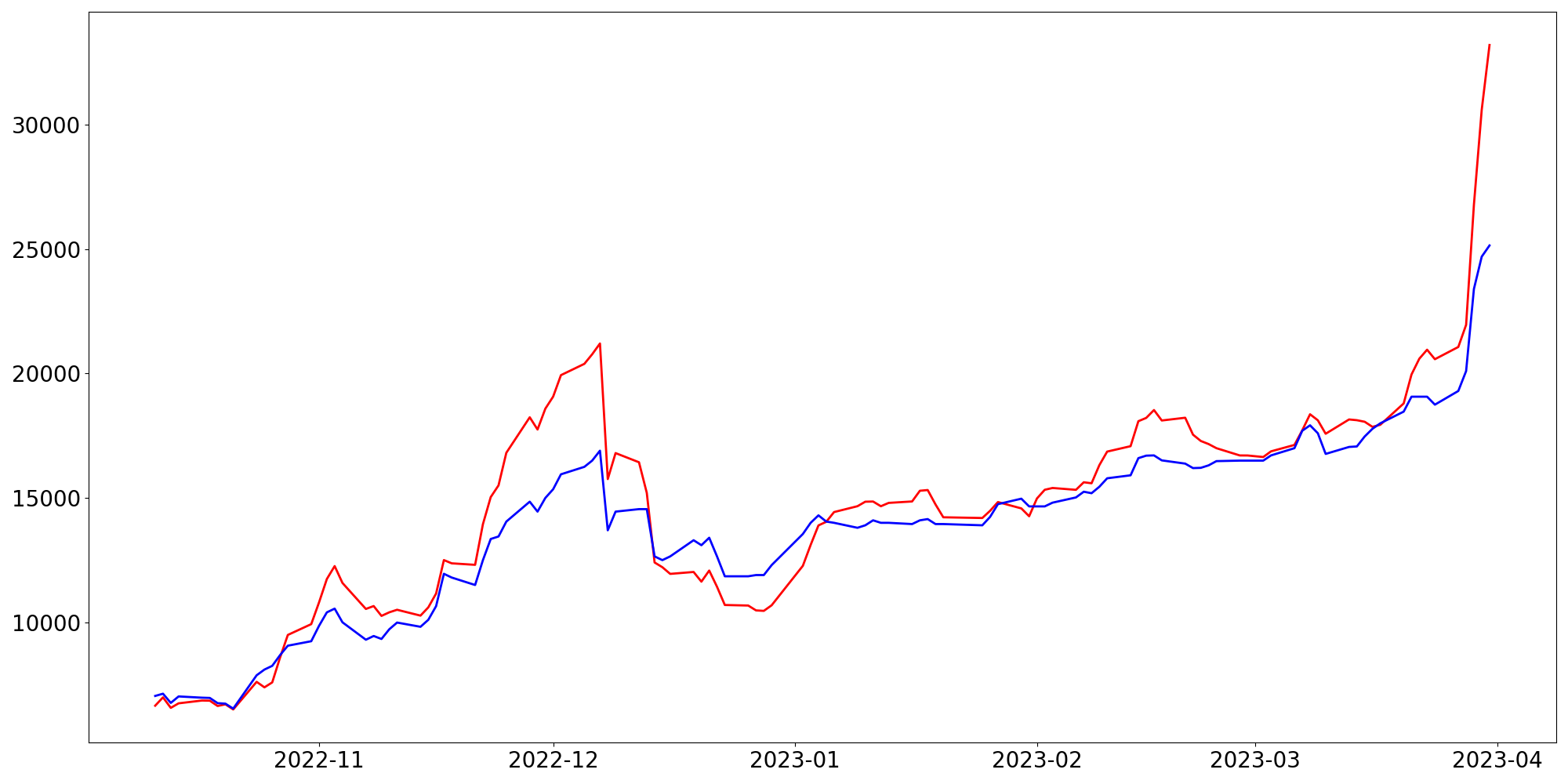 [ - : 실제값(종가) / - : 예측값(종가) ]