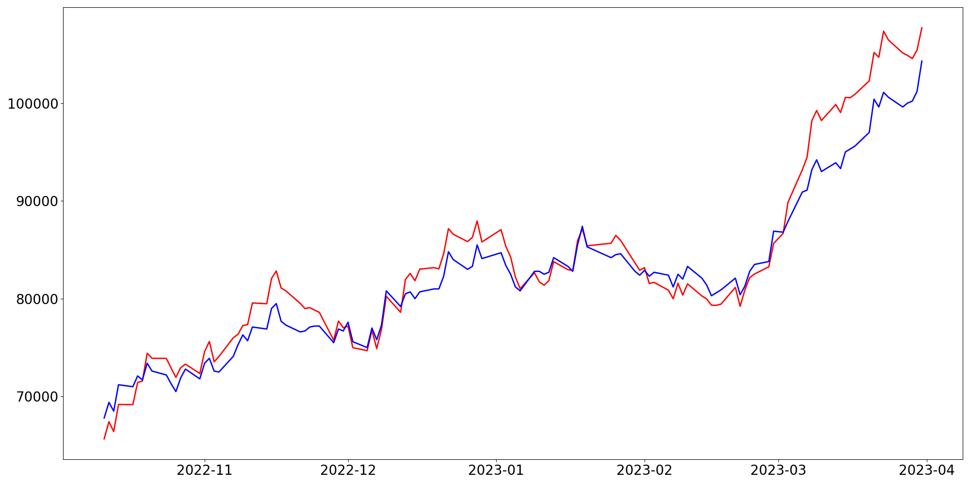 [ - : 실제값(종가) / - : 예측값(종가) ]