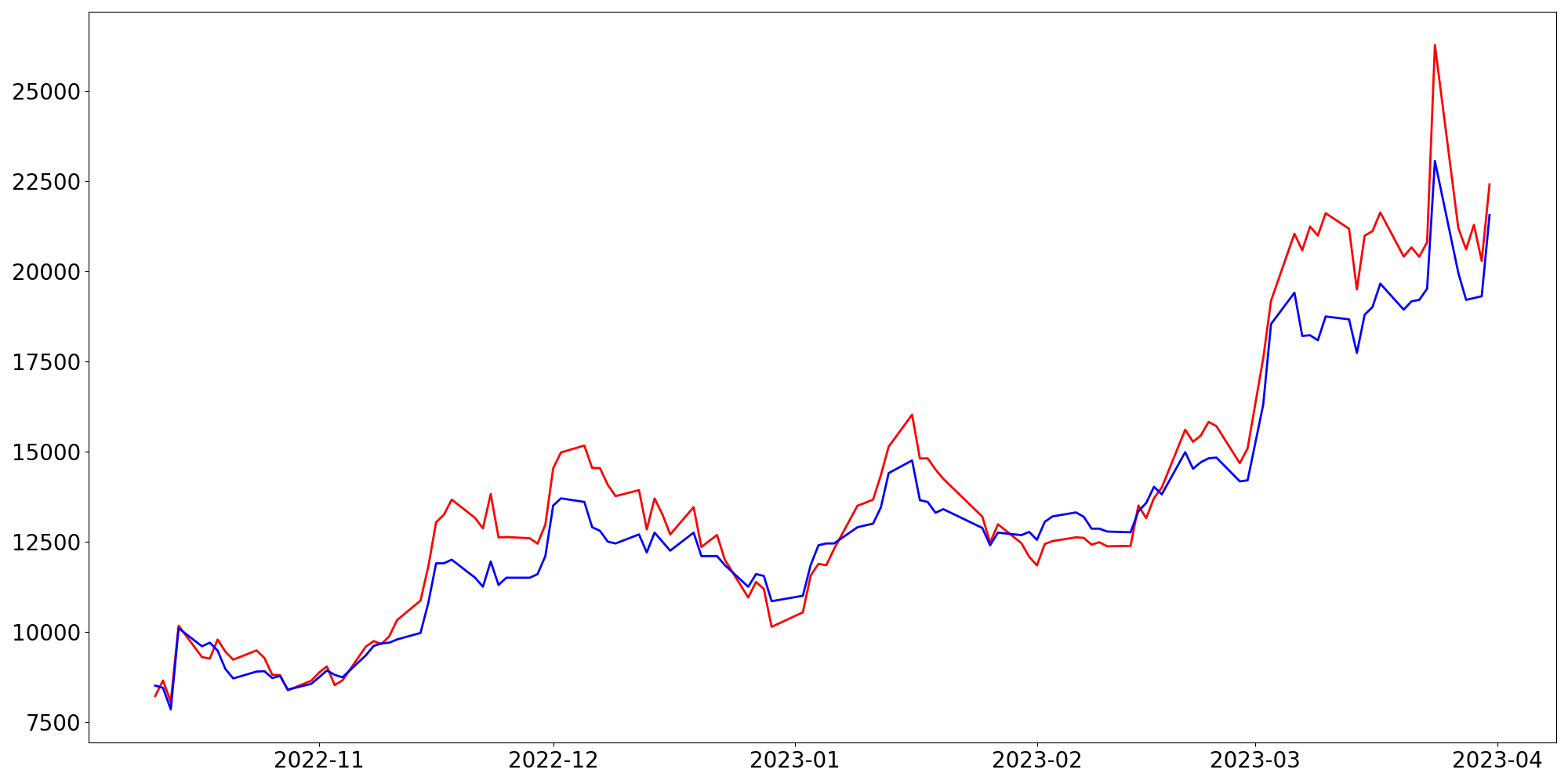 [ - : 실제값(종가) / - : 예측값(종가) ]