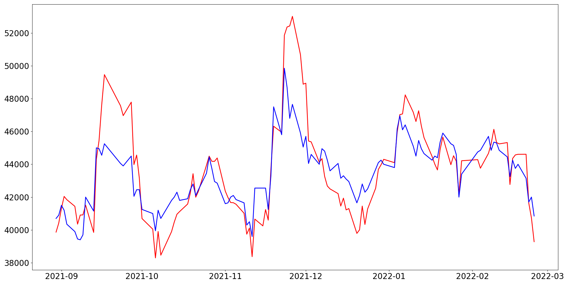 [ - : 실제값(종가) / - : 예측값(종가) ]