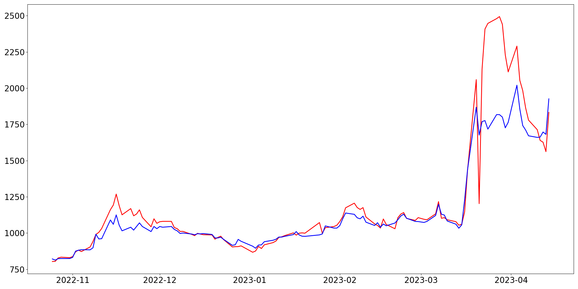 [ - : 실제값(종가) / - : 예측값(종가) ]