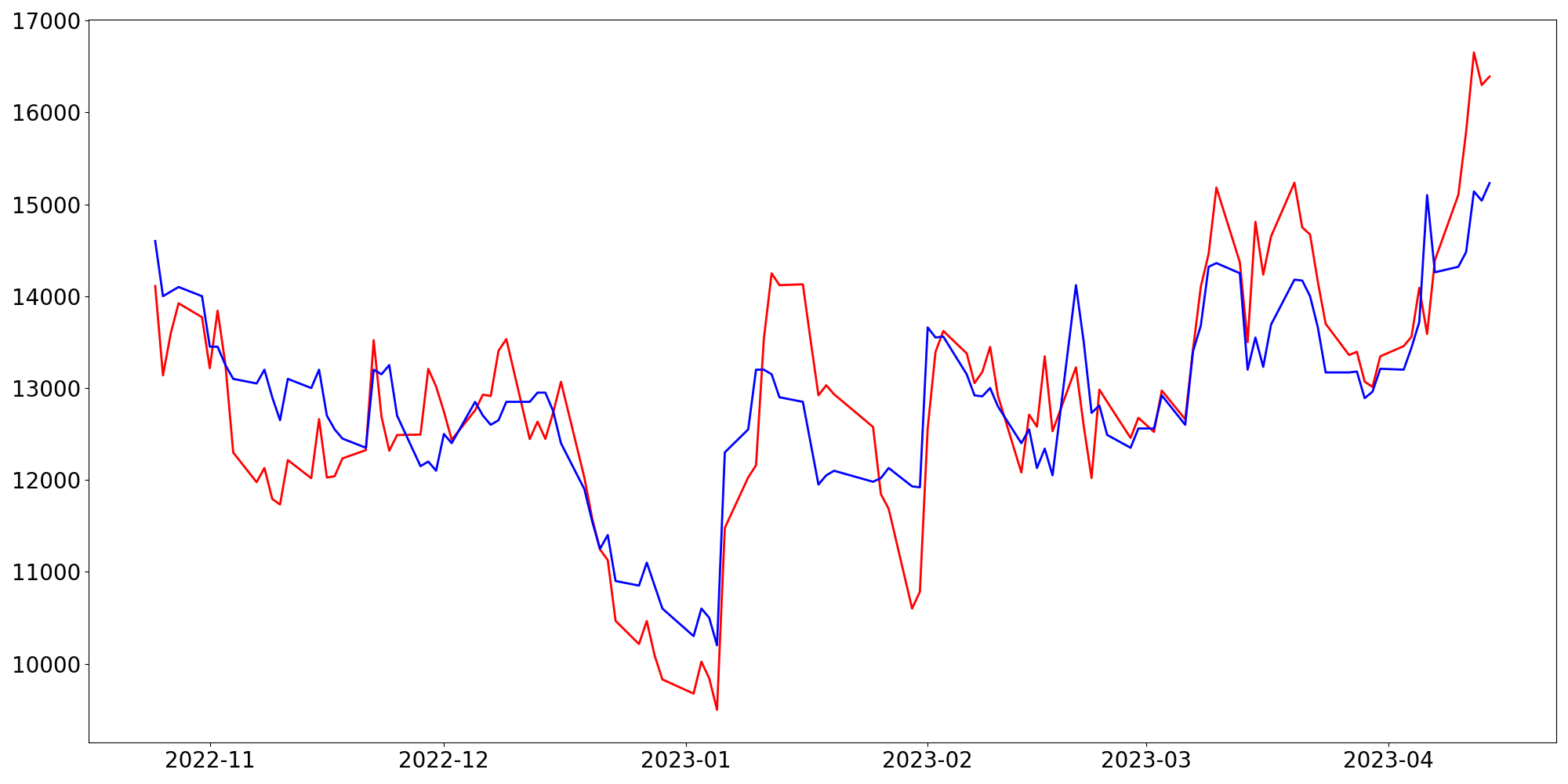 [ - : 실제값(종가) / - : 예측값(종가) ]