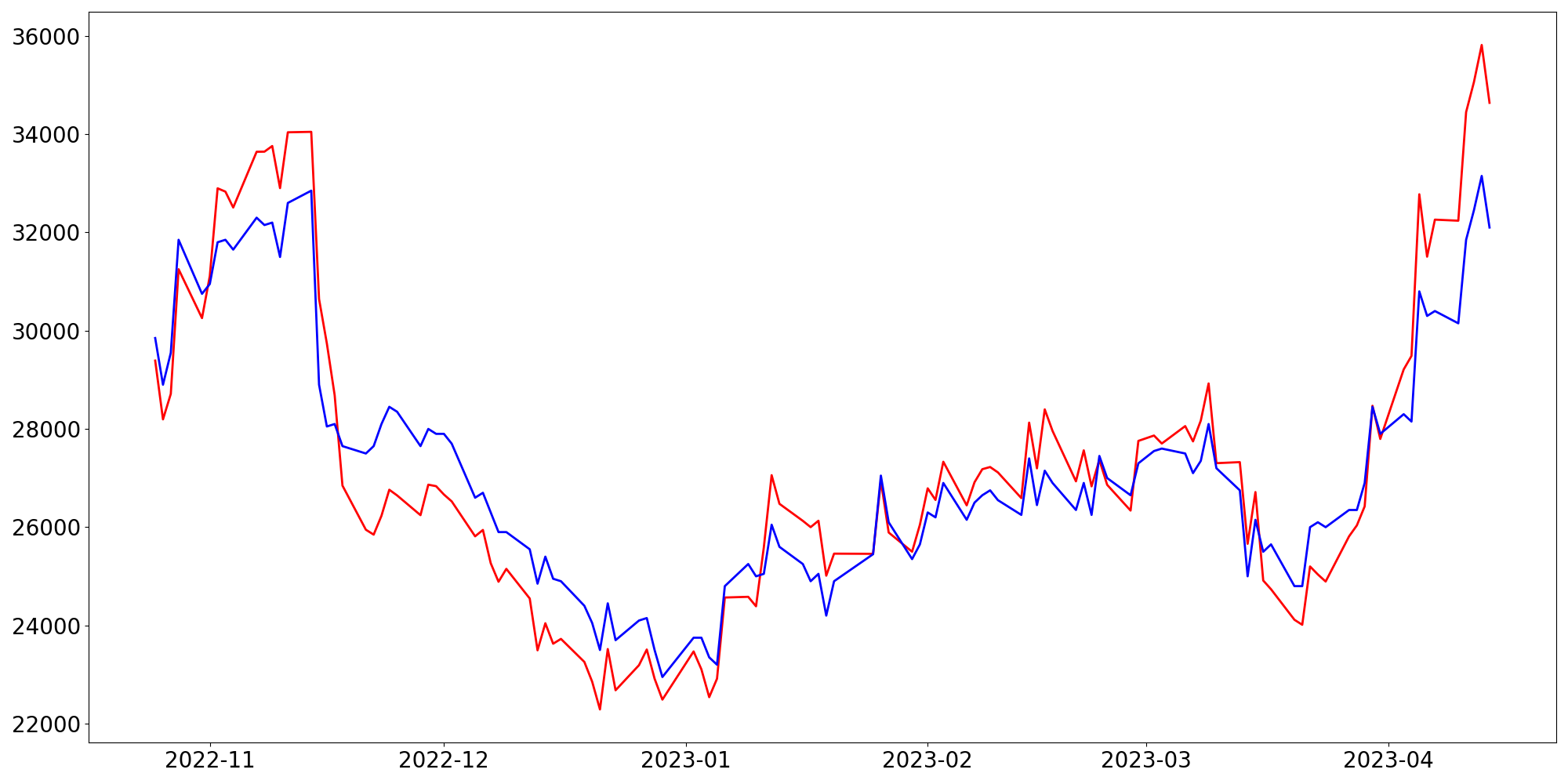 [ - : 실제값(종가) / - : 예측값(종가) ]