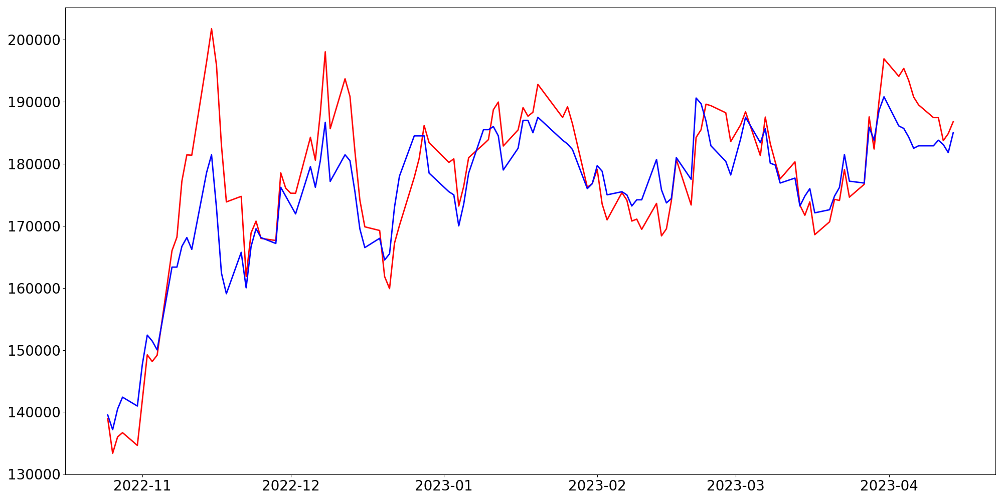 [ - : 실제값(종가) / - : 예측값(종가) ]
