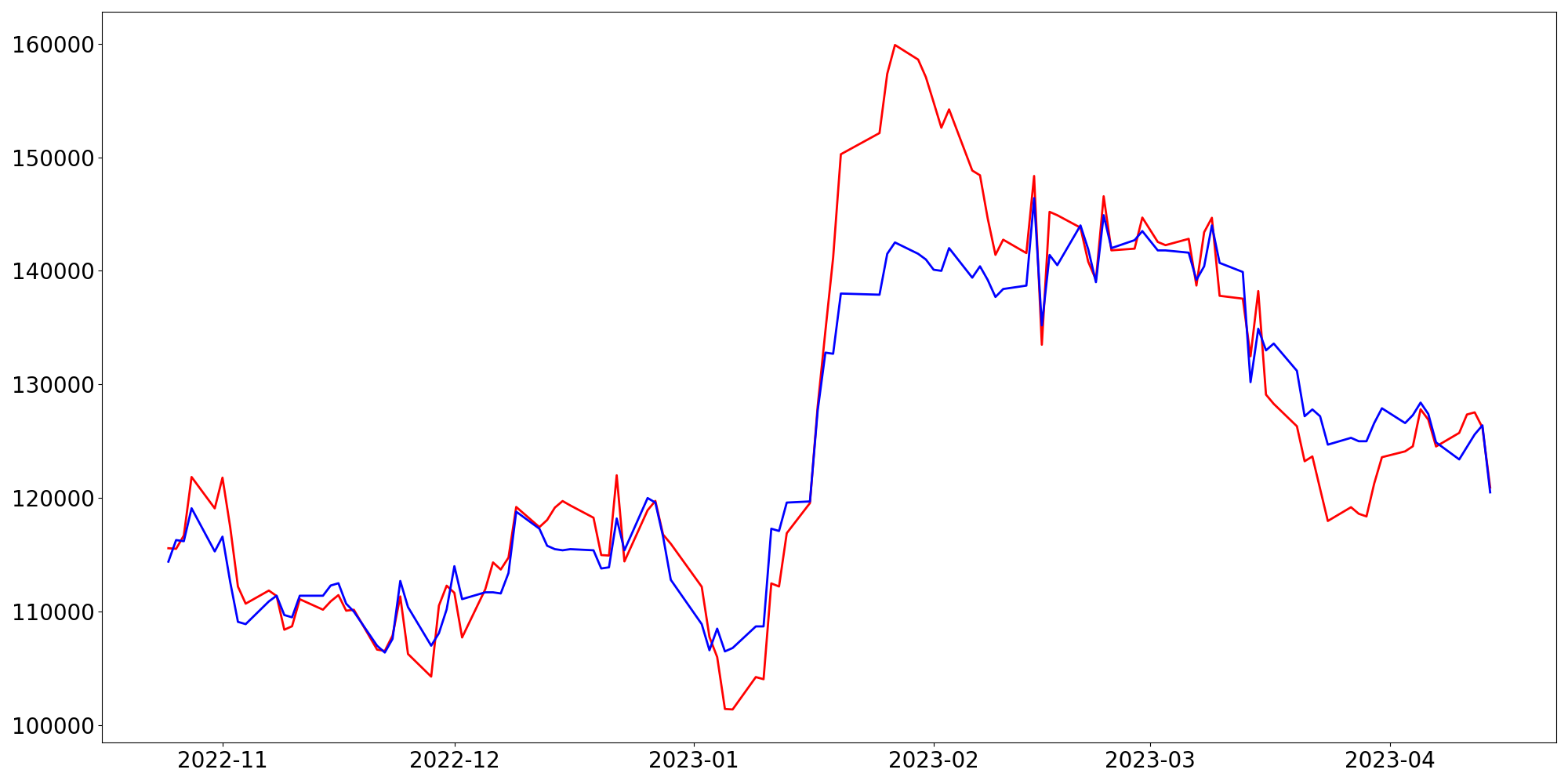 [ - : 실제값(종가) / - : 예측값(종가) ]