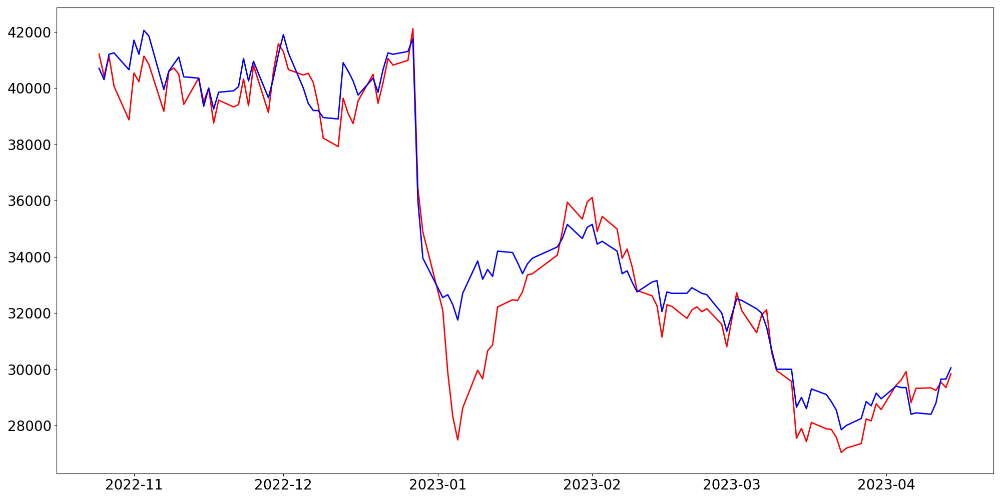 [ - : 실제값(종가) / - : 예측값(종가) ]