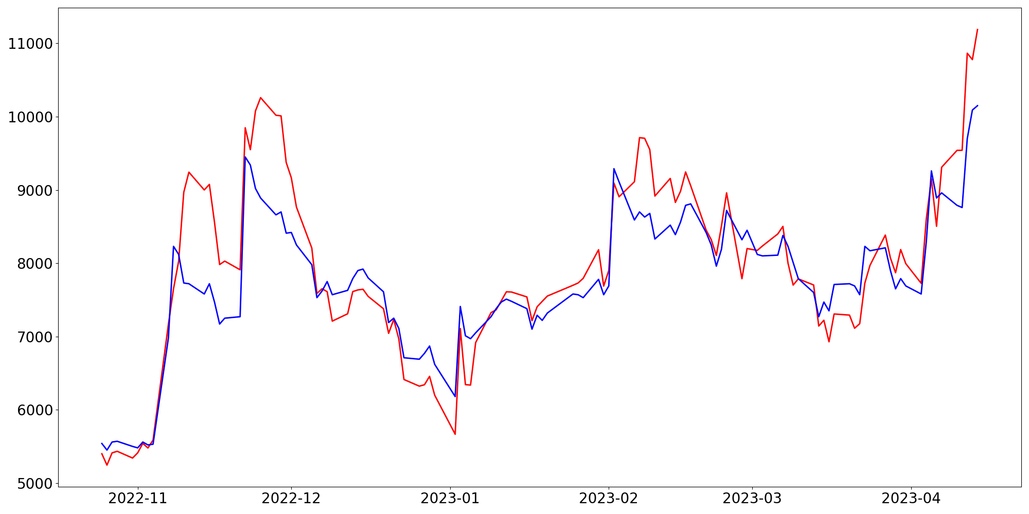[ - : 실제값(종가) / - : 예측값(종가) ]