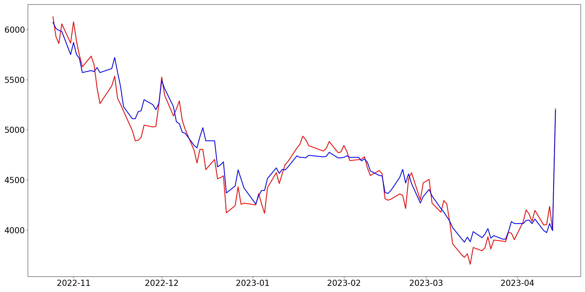 [ - : 실제값(종가) / - : 예측값(종가) ]