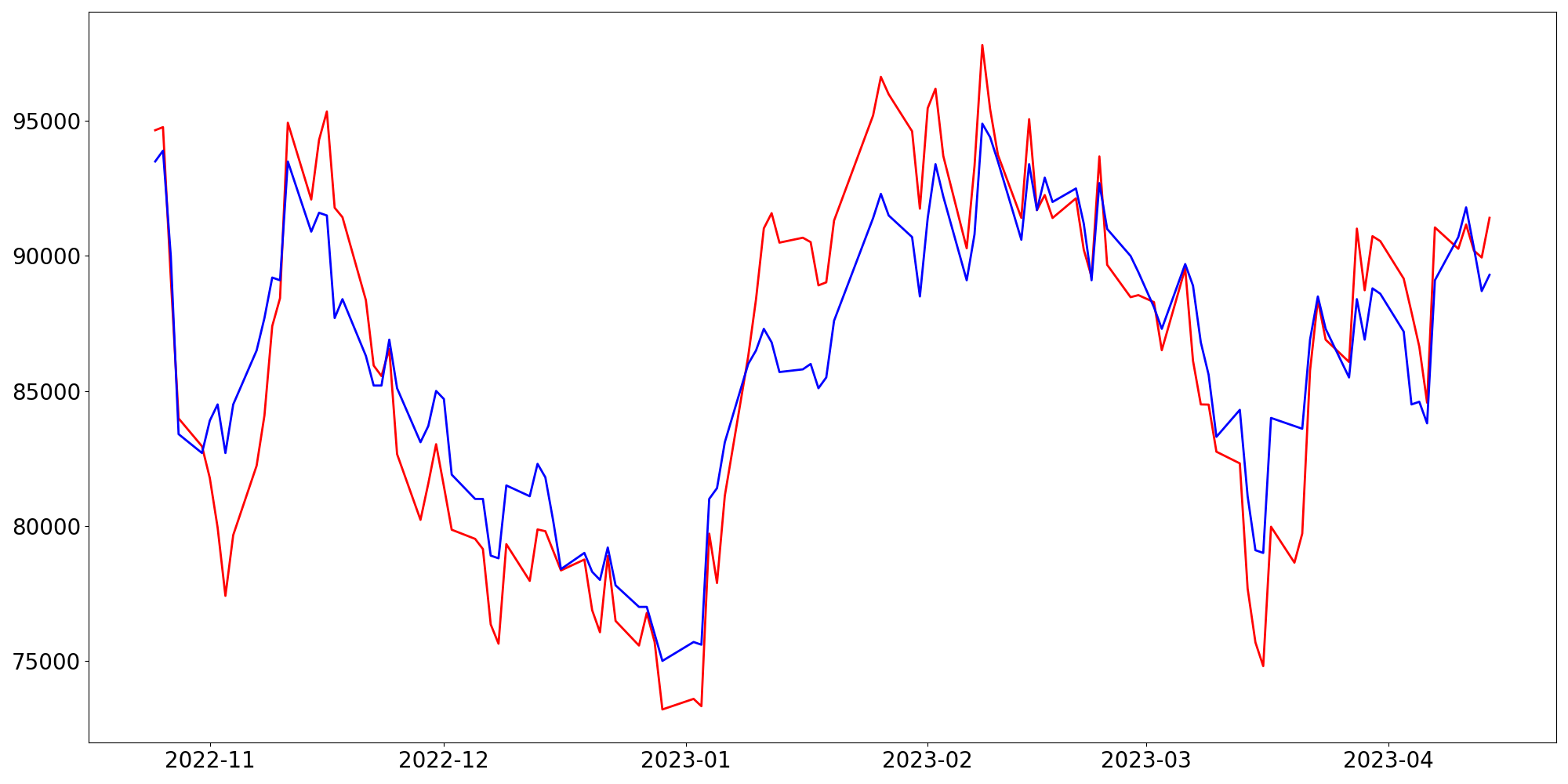 [ - : 실제값(종가) / - : 예측값(종가) ]