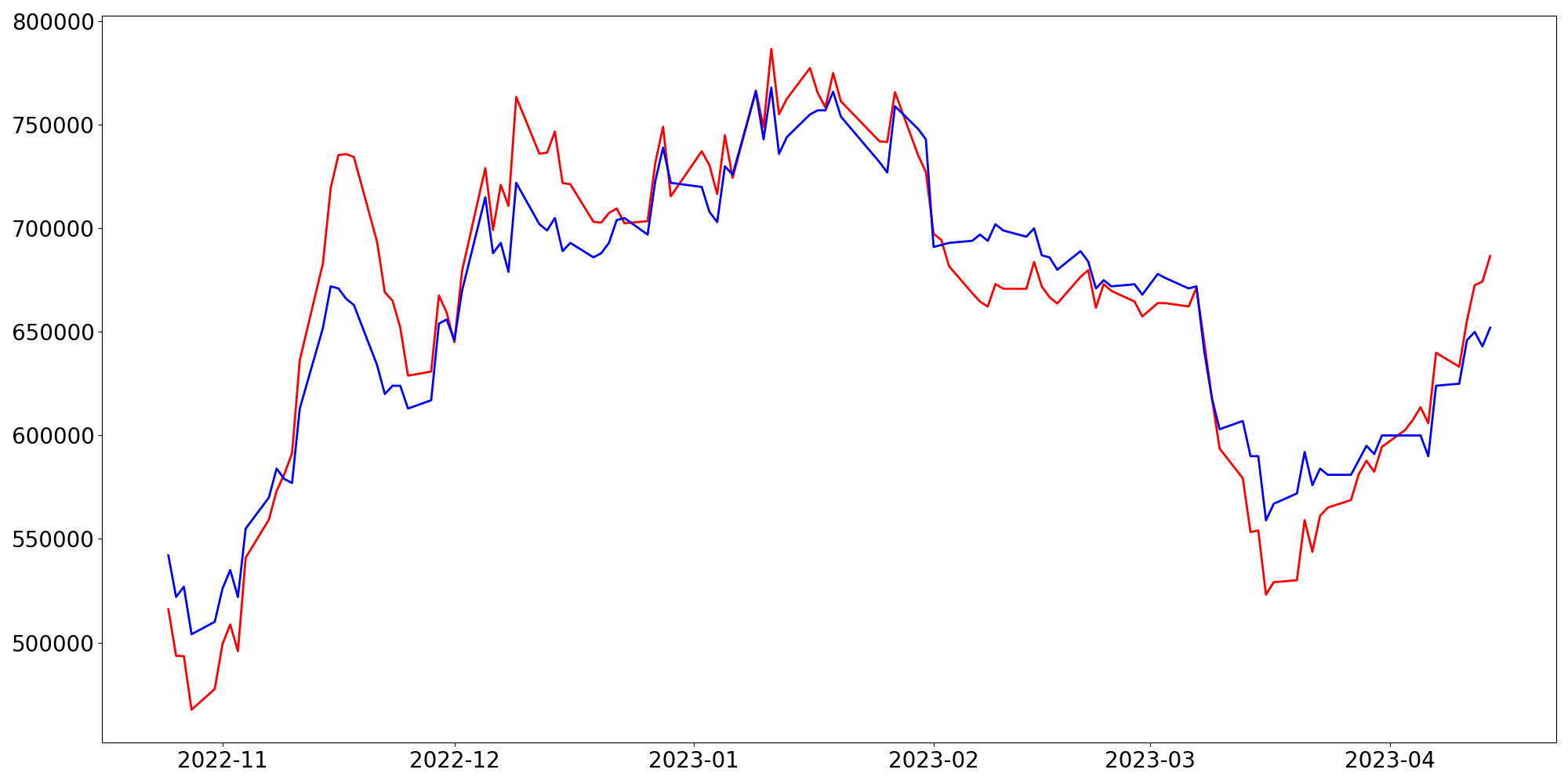 [ - : 실제값(종가) / - : 예측값(종가) ]