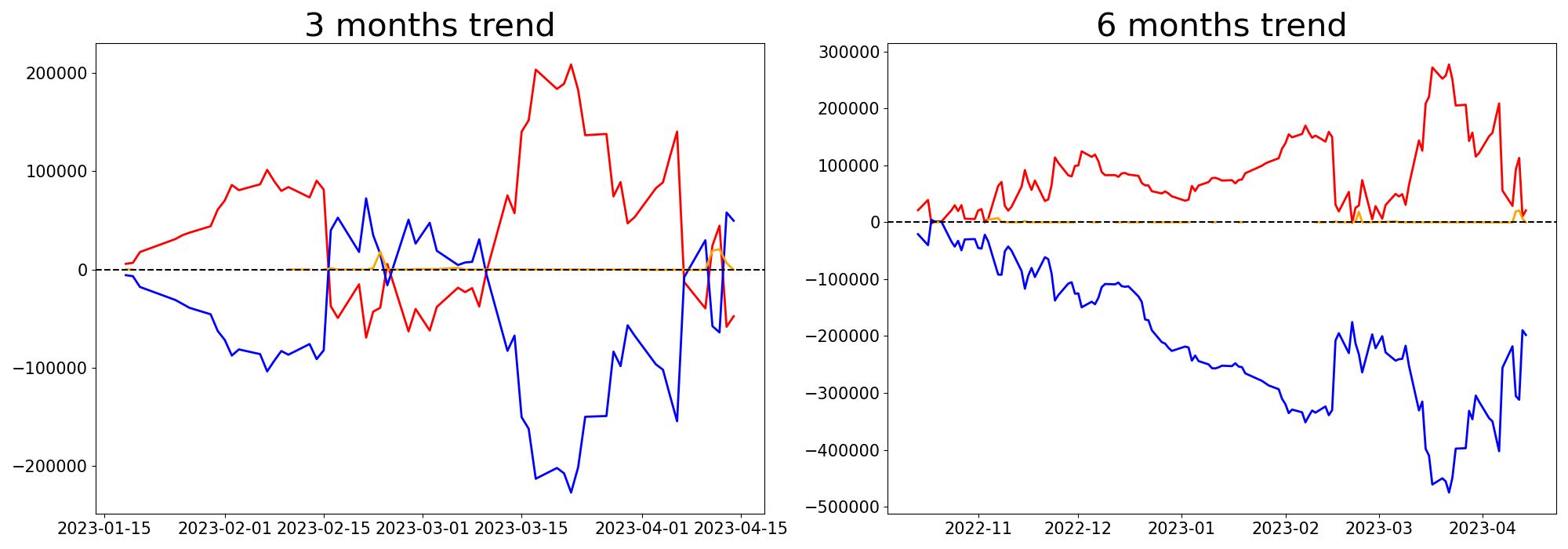 기관, 개인, 외국인으로 분류하여 투자주체별 일정기간동안의 누적적 매수/매도 현황을 분석한 내용입니다. 특정일의 투자자별 매매동향을 통해서 단기간의 시장충격여부를 판단할 수 있으며 장기적인 매매동향을 통해서 해당 종목의 장기 모멘텀을 판단해 볼 수 있습니다.