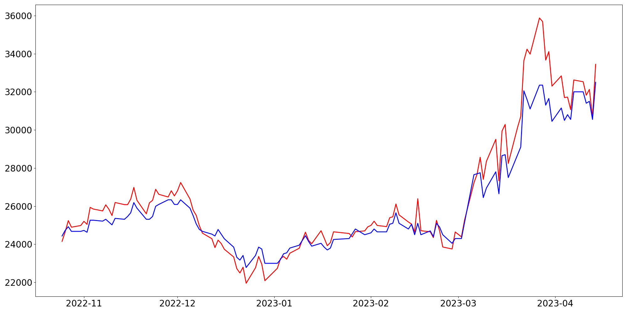 [ - : 실제값(종가) / - : 예측값(종가) ]