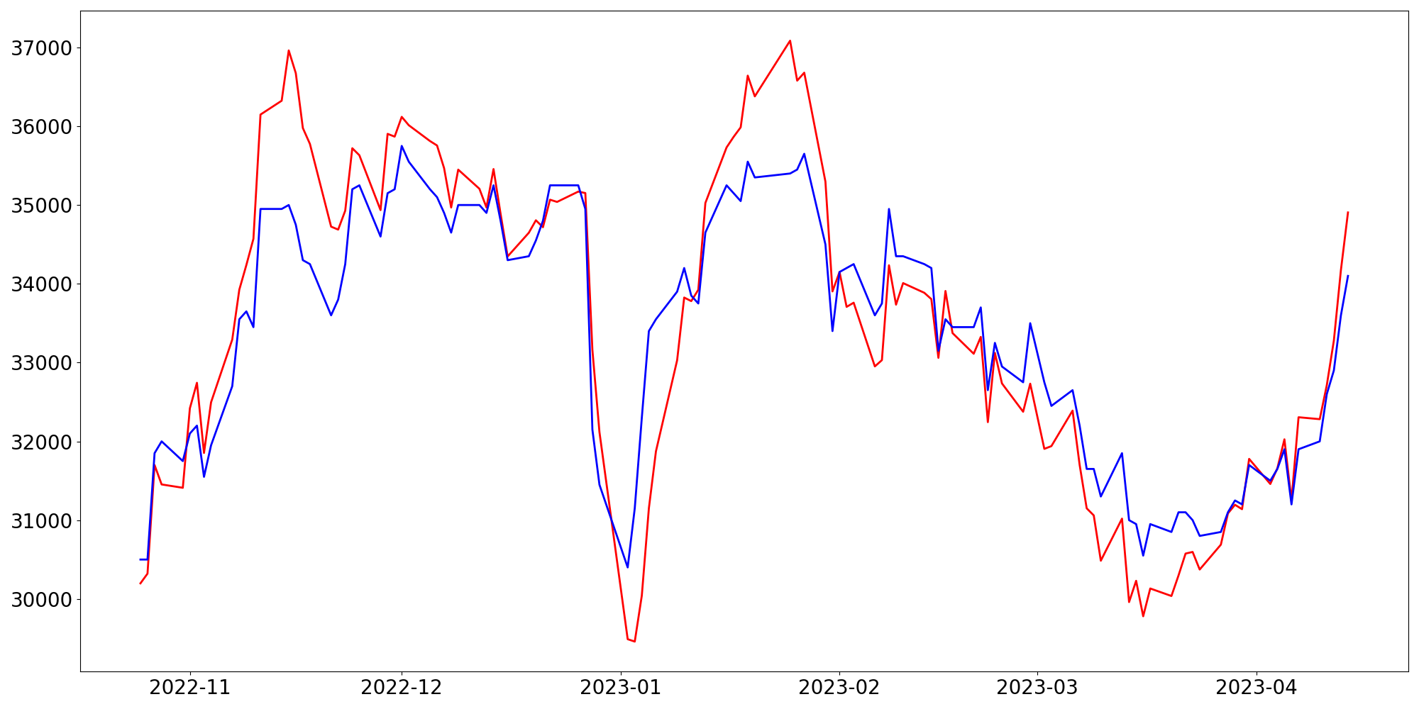 [ - : 실제값(종가) / - : 예측값(종가) ]