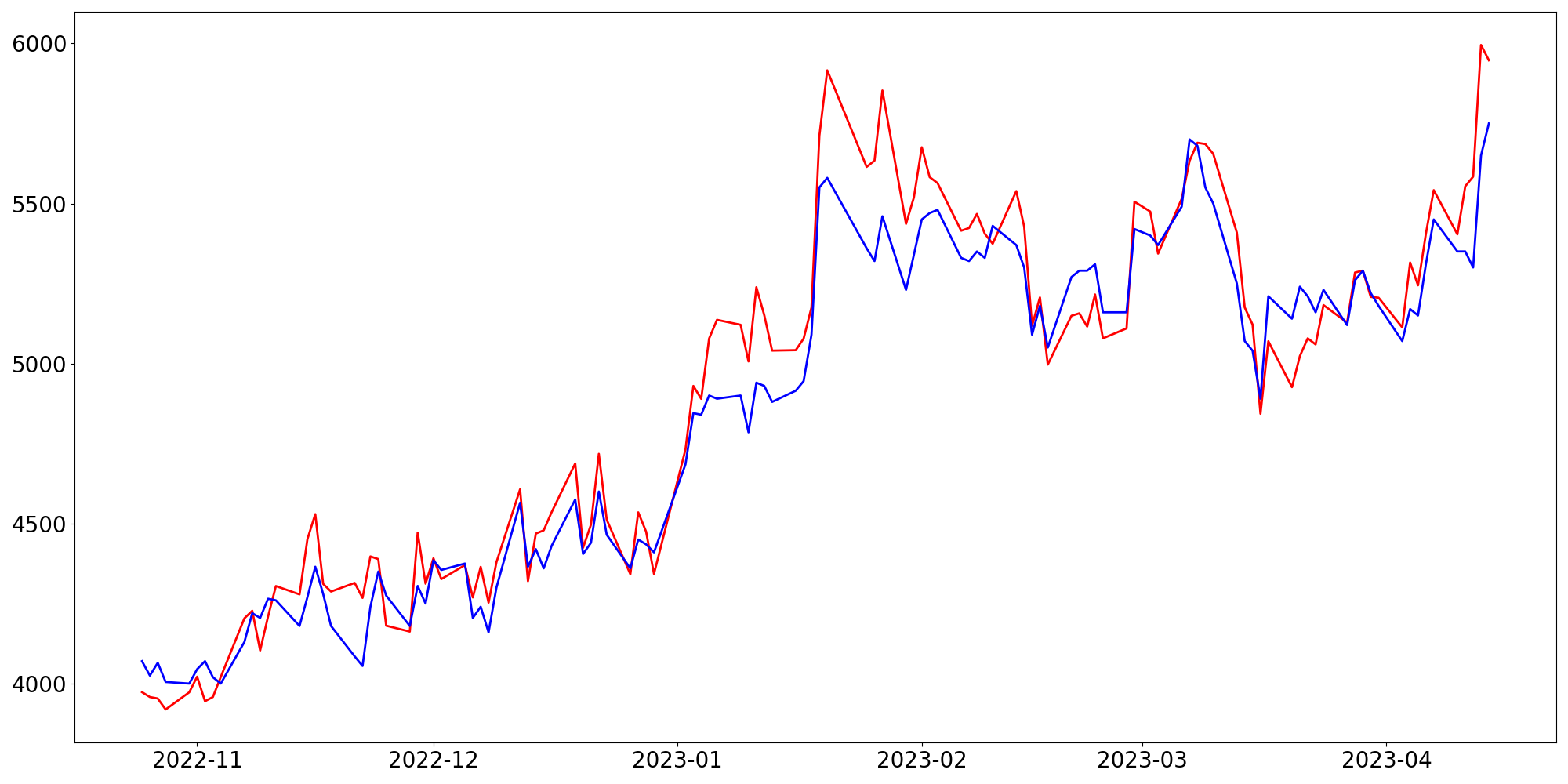 [ - : 실제값(종가) / - : 예측값(종가) ]