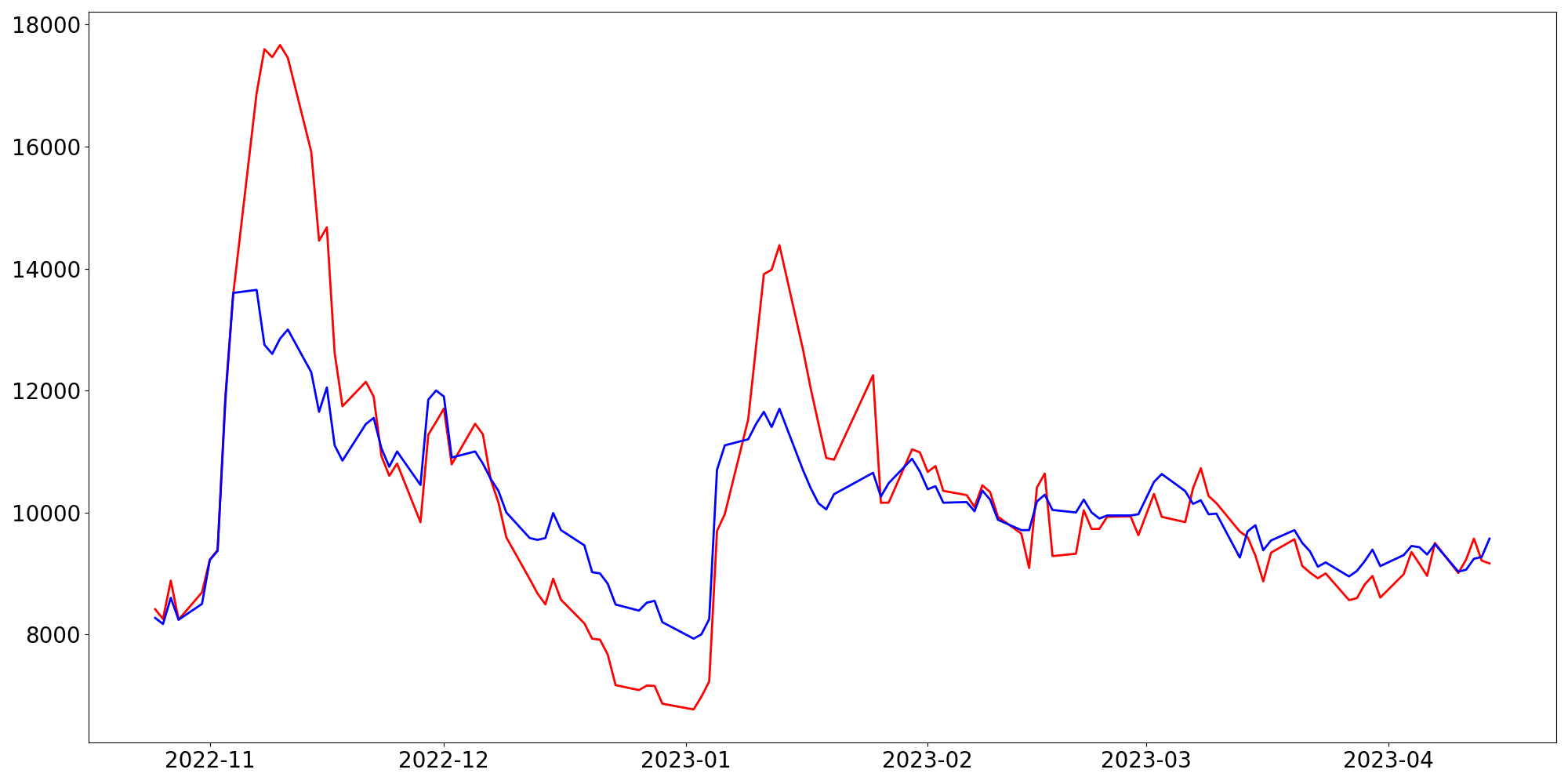 [ - : 실제값(종가) / - : 예측값(종가) ]