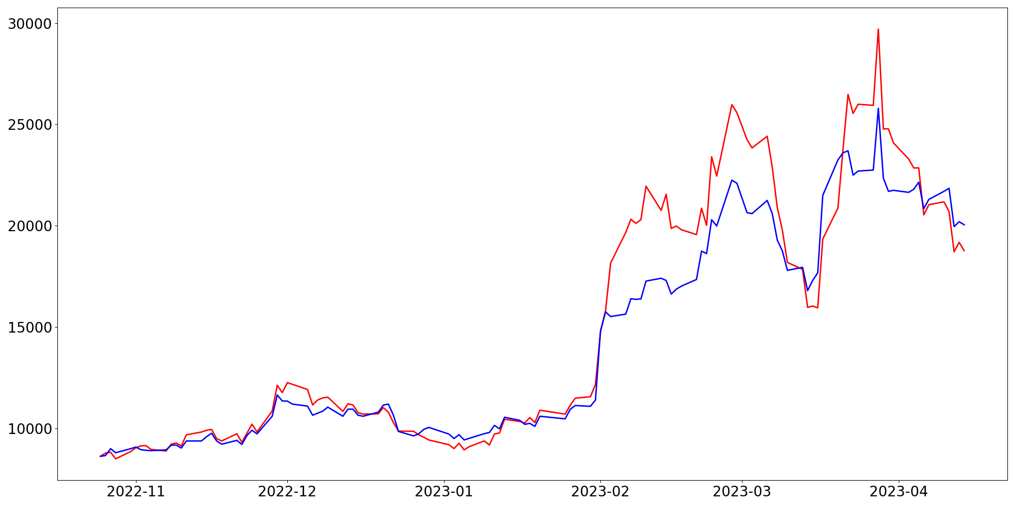 [ - : 실제값(종가) / - : 예측값(종가) ]