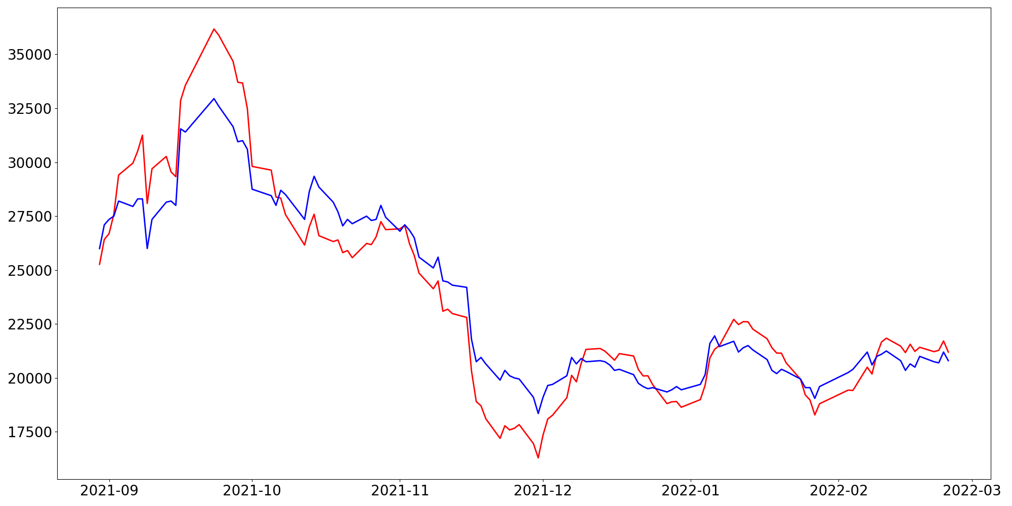 [ - : 실제값(종가) / - : 예측값(종가) ]