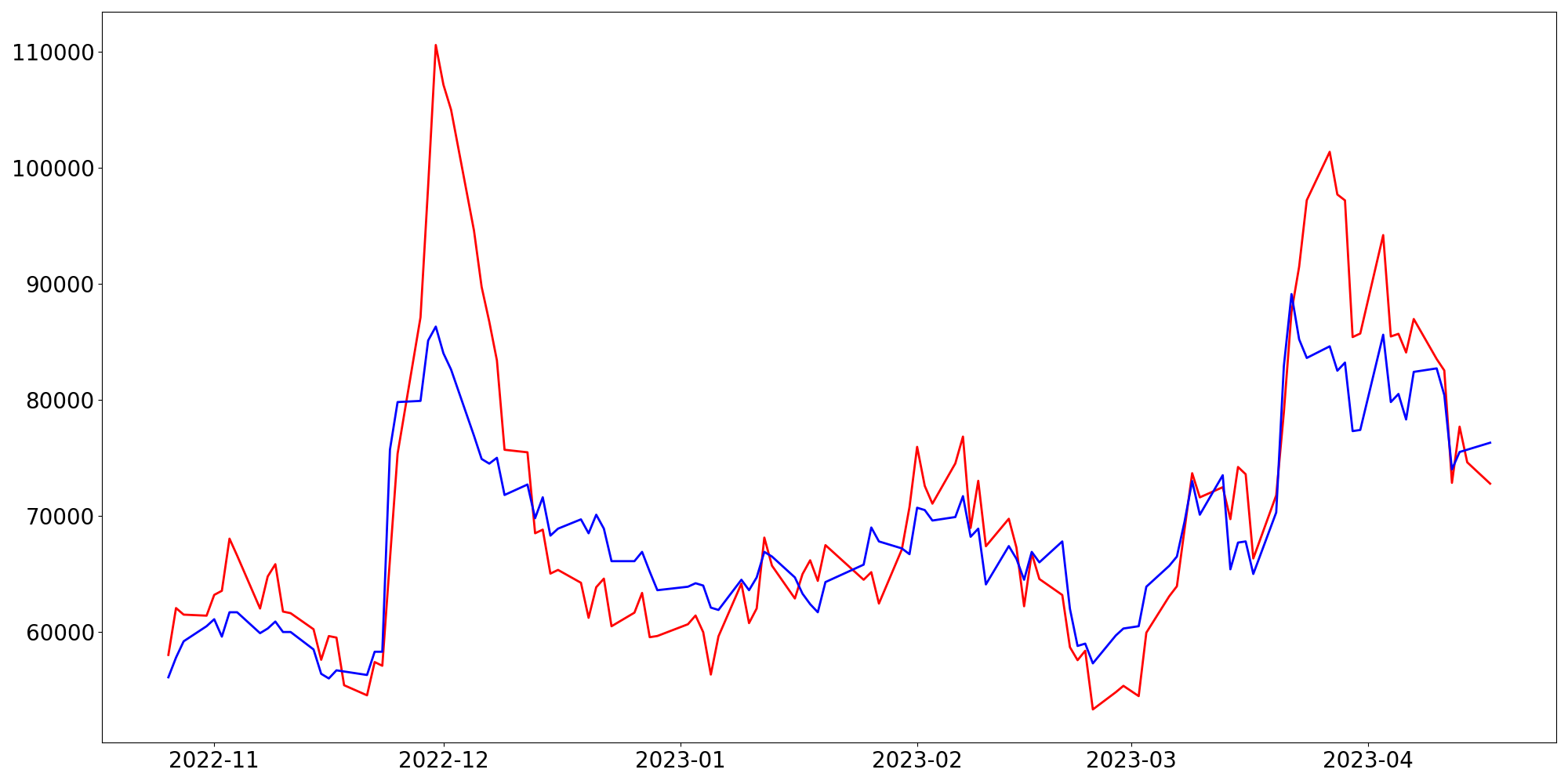 [ - : 실제값(종가) / - : 예측값(종가) ]