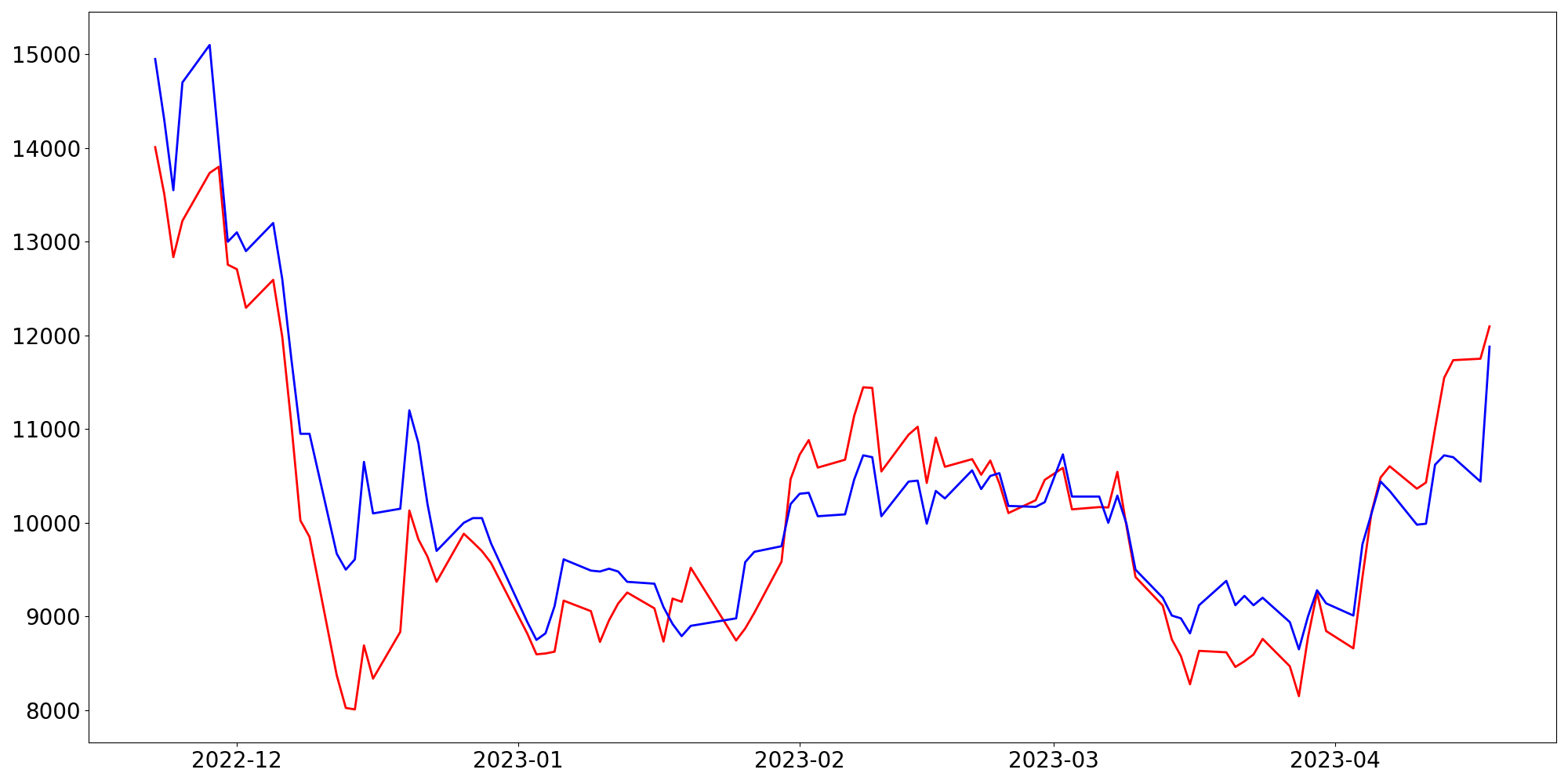 [ - : 실제값(종가) / - : 예측값(종가) ]