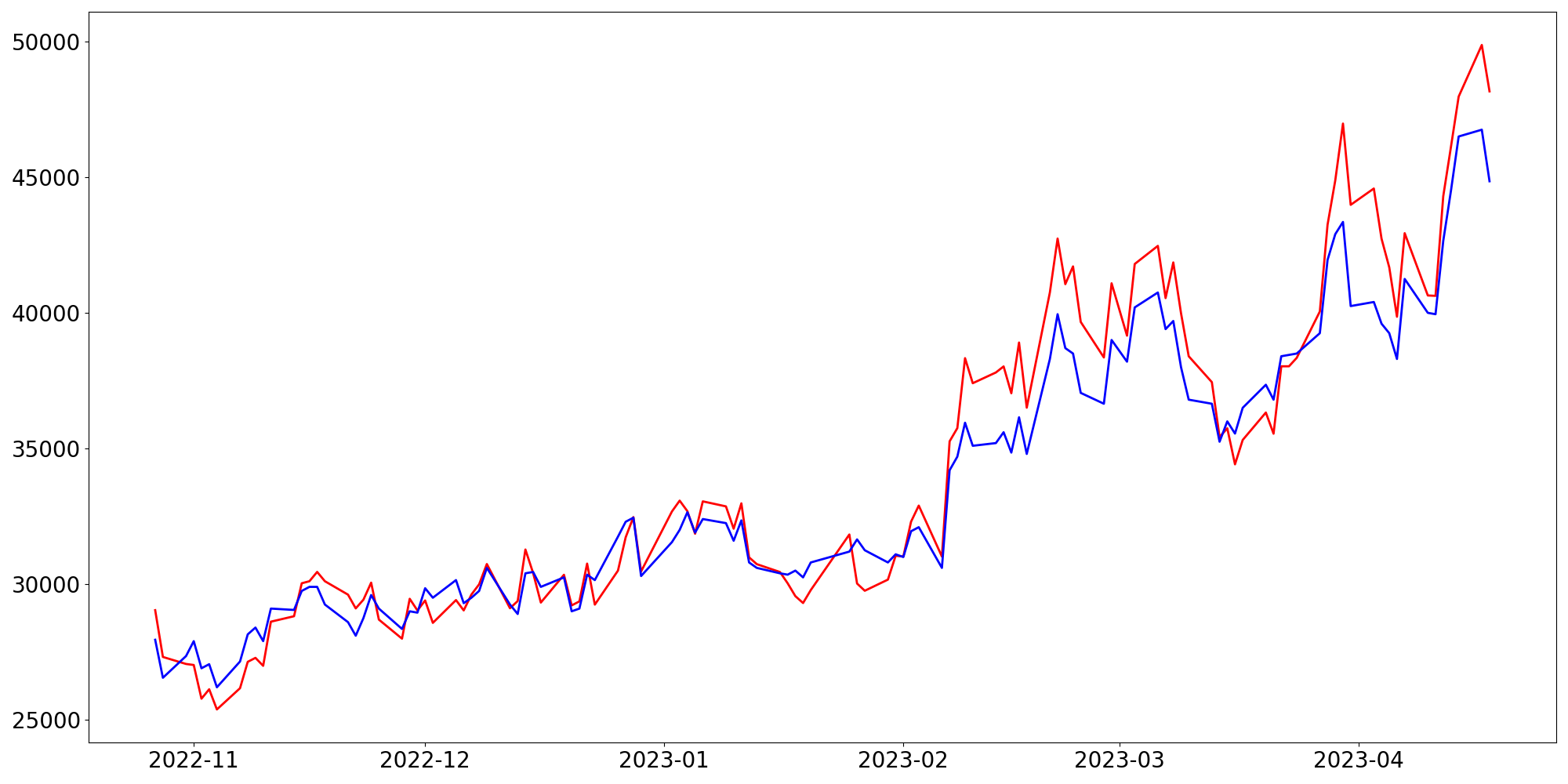 [ - : 실제값(종가) / - : 예측값(종가) ]