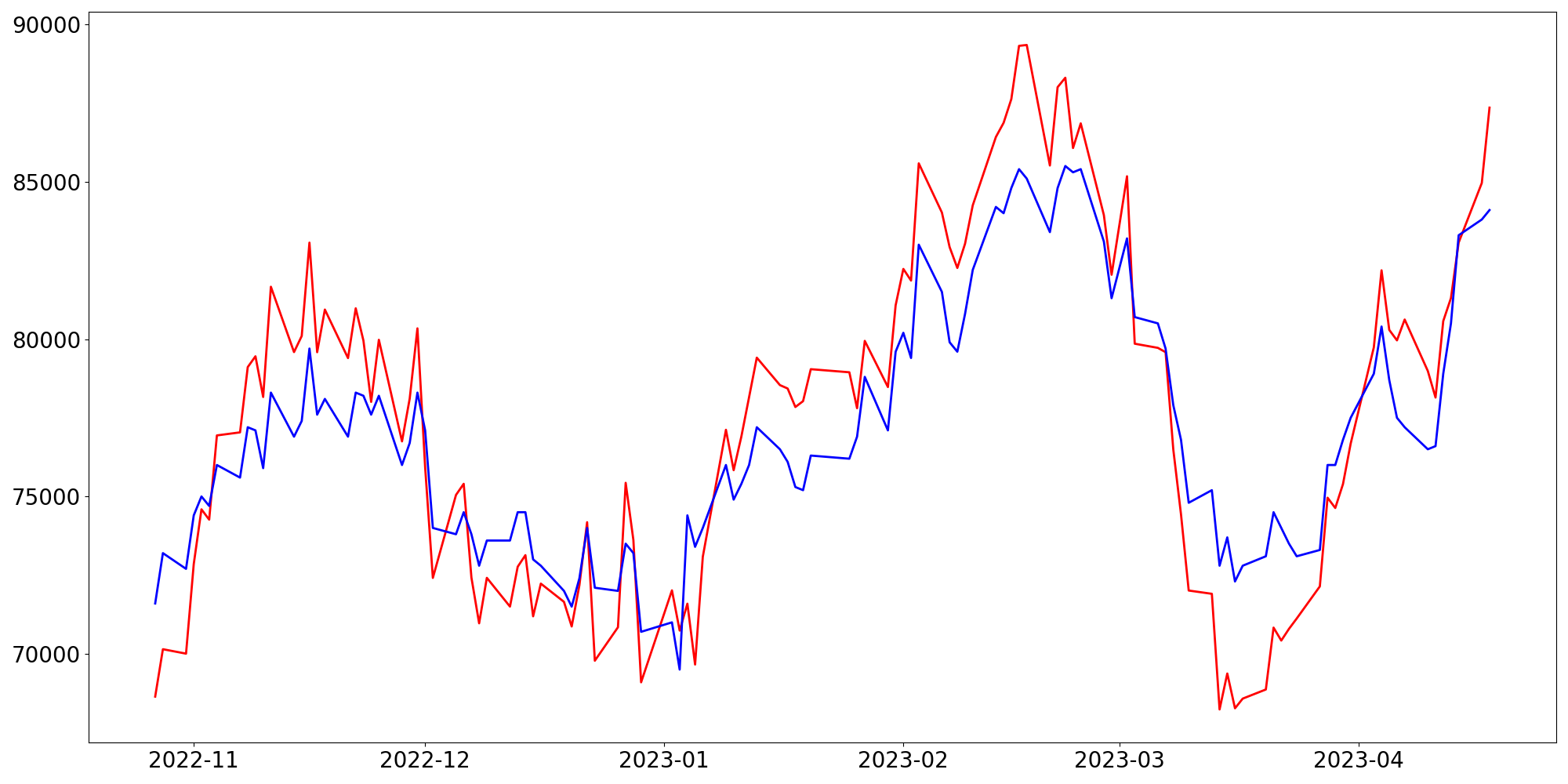 [ - : 실제값(종가) / - : 예측값(종가) ]