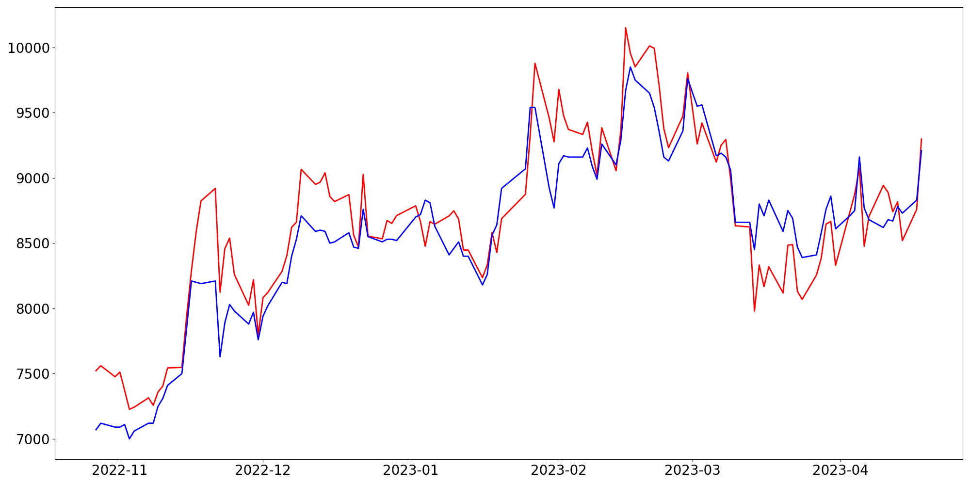 [ - : 실제값(종가) / - : 예측값(종가) ]