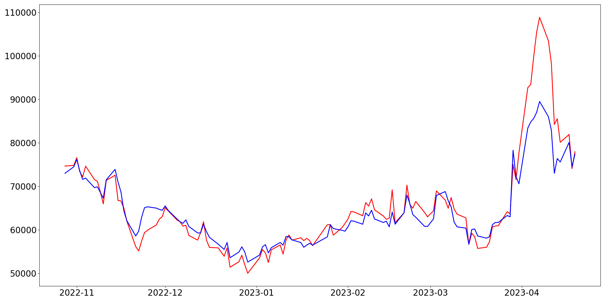 [ - : 실제값(종가) / - : 예측값(종가) ]
