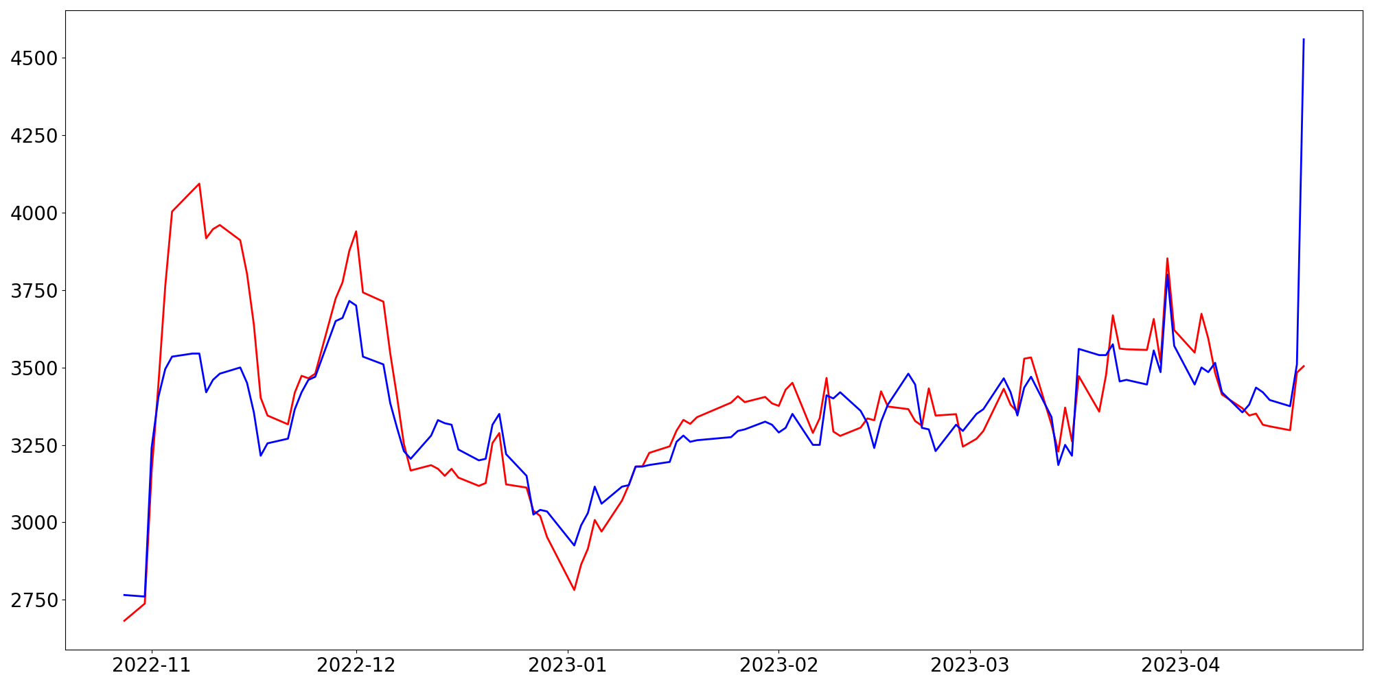 [ - : 실제값(종가) / - : 예측값(종가) ]