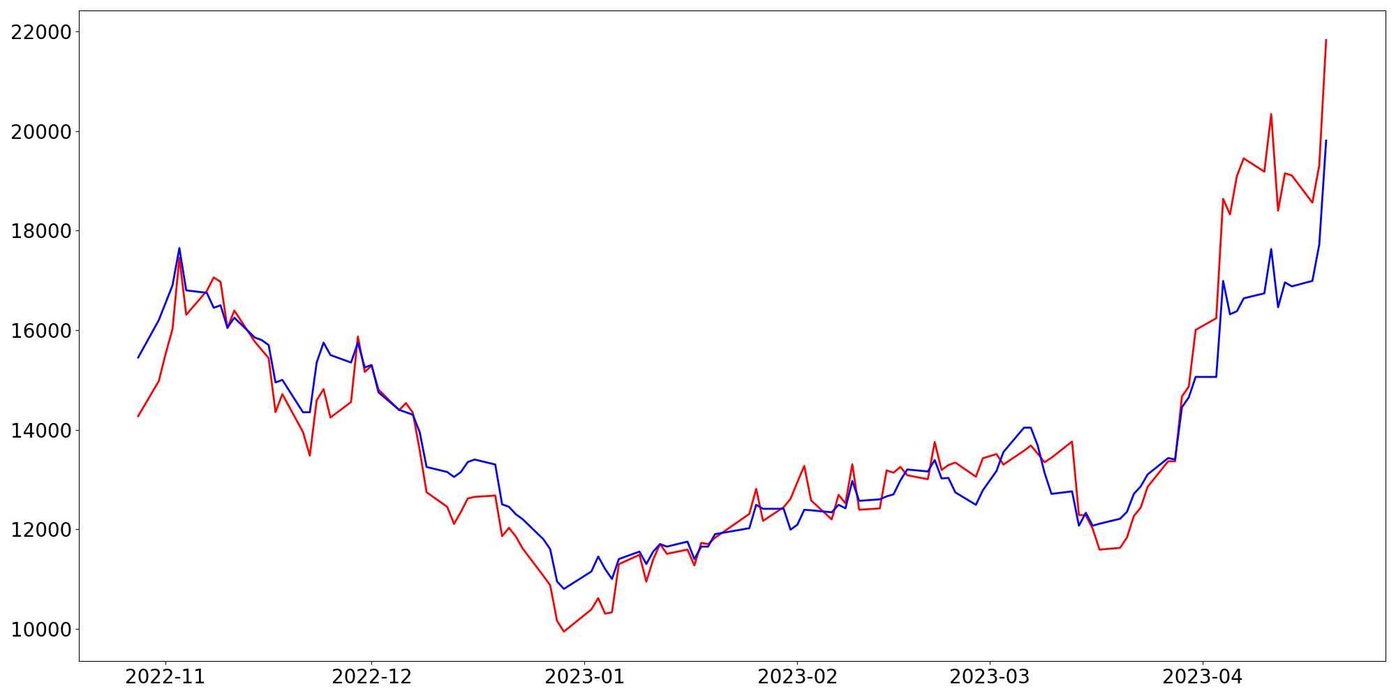 [ - : 실제값(종가) / - : 예측값(종가) ]