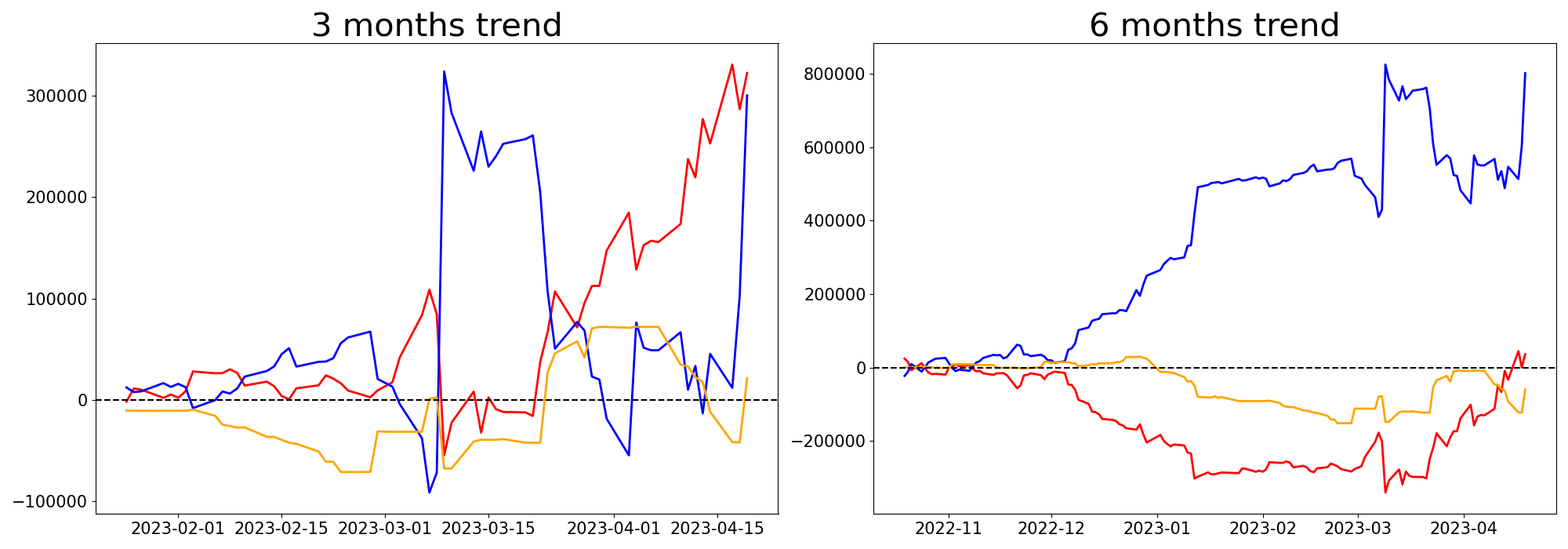 기관, 개인, 외국인으로 분류하여 투자주체별 일정기간동안의 누적적 매수/매도 현황을 분석한 내용입니다. 특정일의 투자자별 매매동향을 통해서 단기간의 시장충격여부를 판단할 수 있으며 장기적인 매매동향을 통해서 해당 종목의 장기 모멘텀을 판단해 볼 수 있습니다.