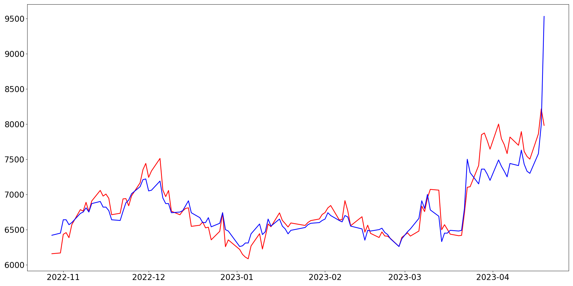 [ - : 실제값(종가) / - : 예측값(종가) ]