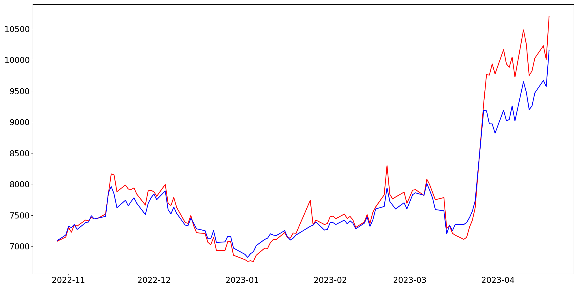 [ - : 실제값(종가) / - : 예측값(종가) ]