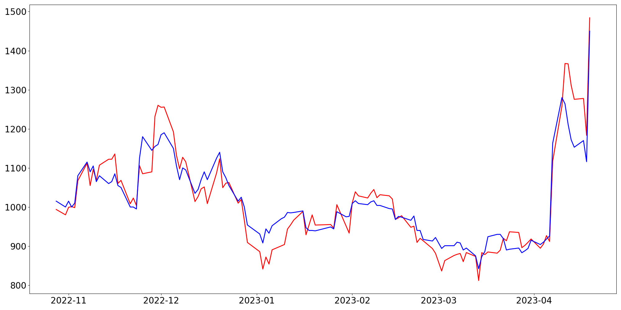 [ - : 실제값(종가) / - : 예측값(종가) ]