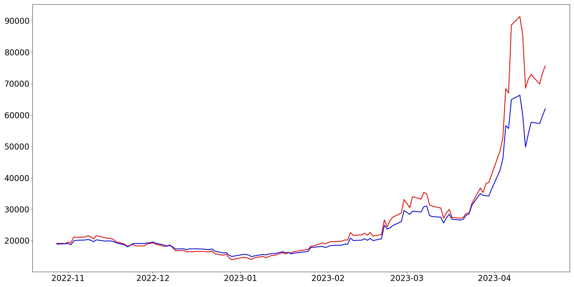 [ - : 실제값(종가) / - : 예측값(종가) ]
