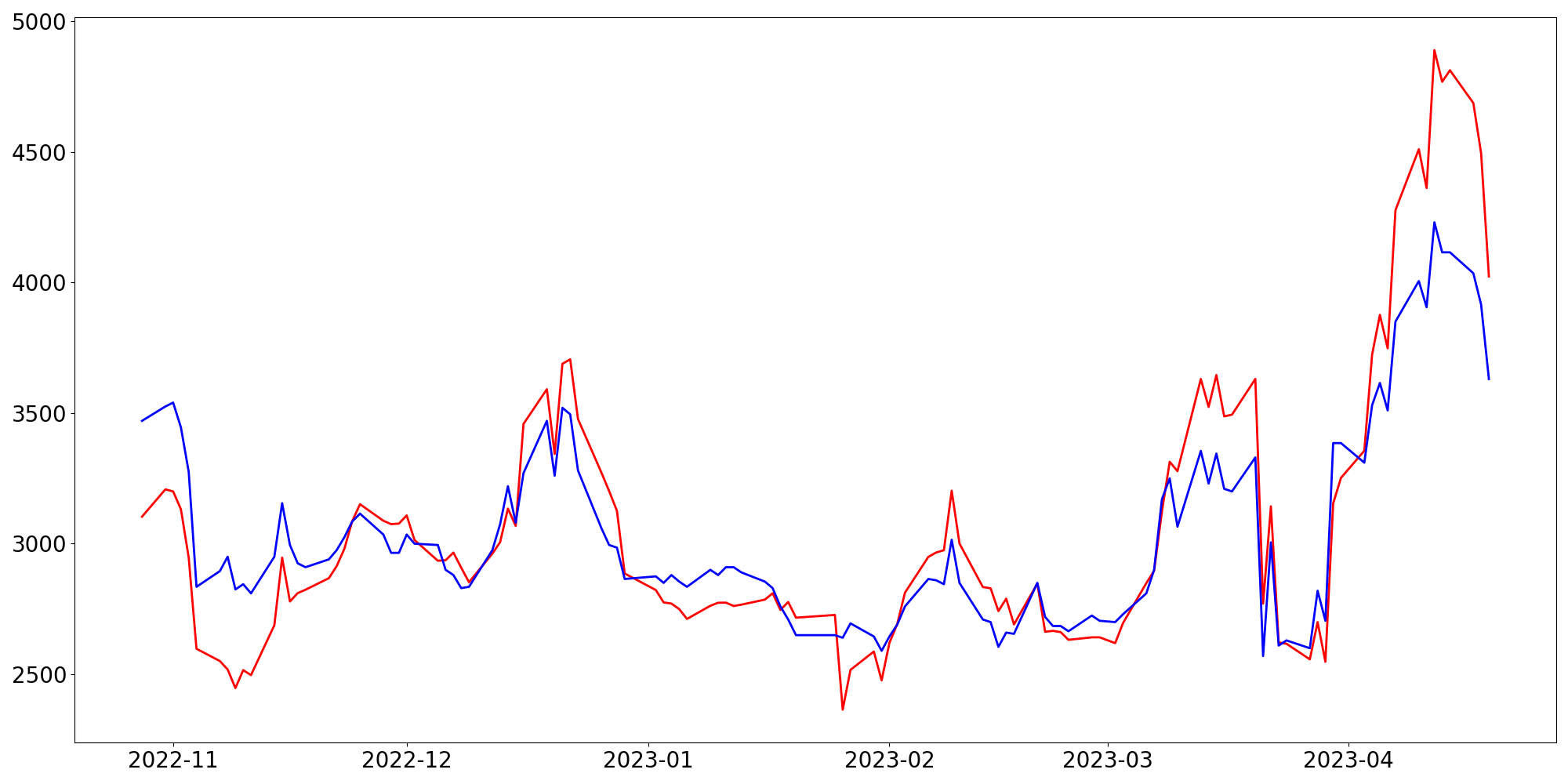 [ - : 실제값(종가) / - : 예측값(종가) ]