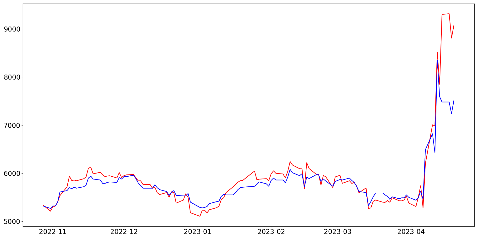 [ - : 실제값(종가) / - : 예측값(종가) ]