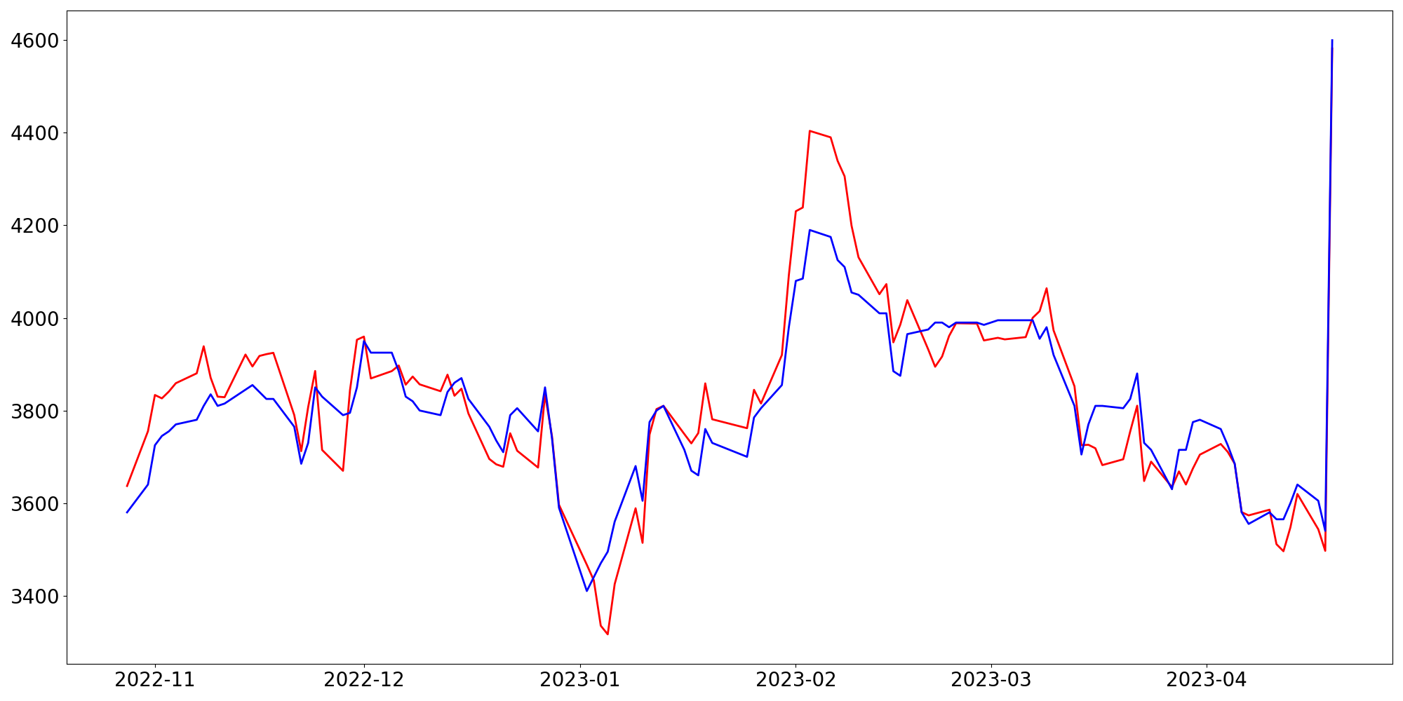 [ - : 실제값(종가) / - : 예측값(종가) ]