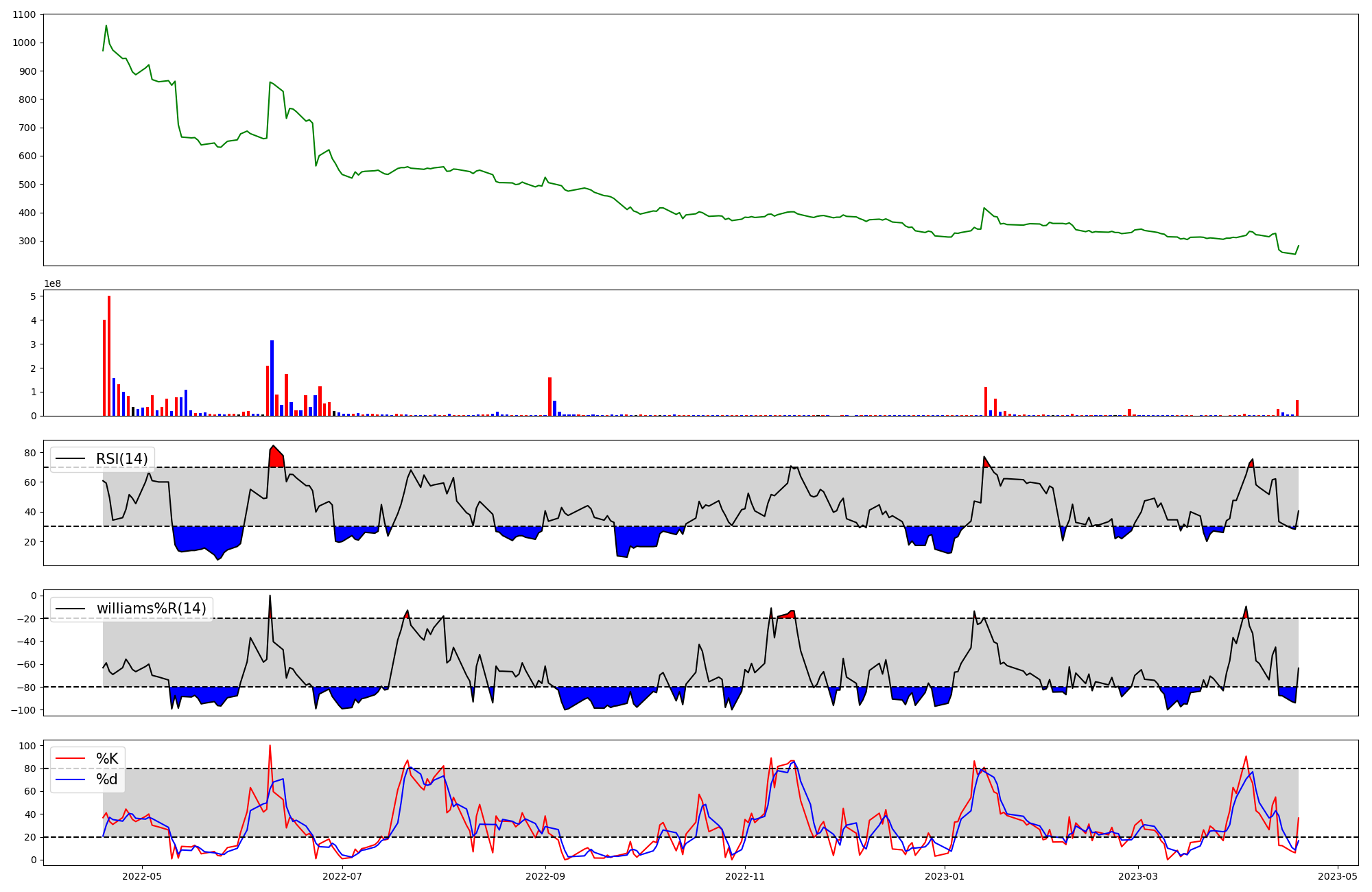 일별 기술적 지표(모멘텀 / 추세 / 시장강도 등)를 활용하여 향후 주가의 움직임을 회귀분석(Regression Analysis)을 통햬 예측해 본 결과입니다.