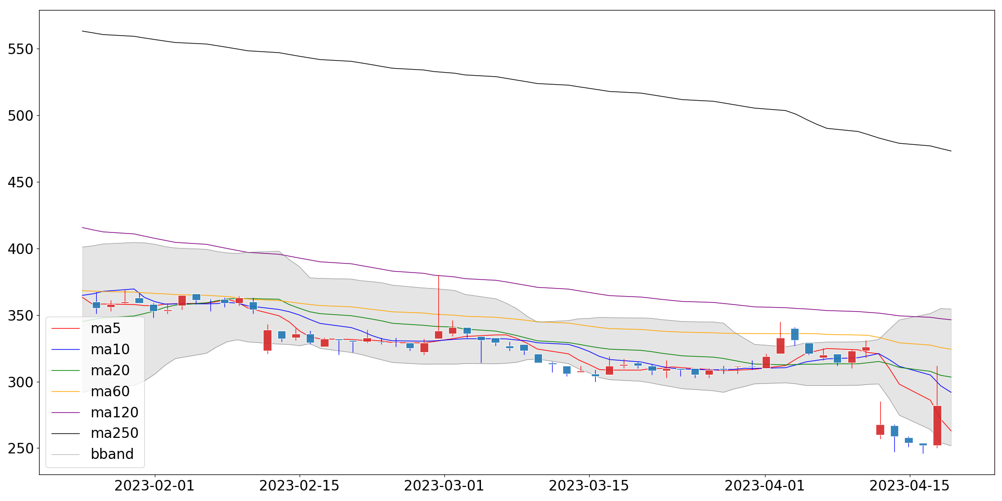 □  중기 : 현재 종가가 중기(60일) 이동평균값(324원)을 하회 하여 중기적 추세 하락
