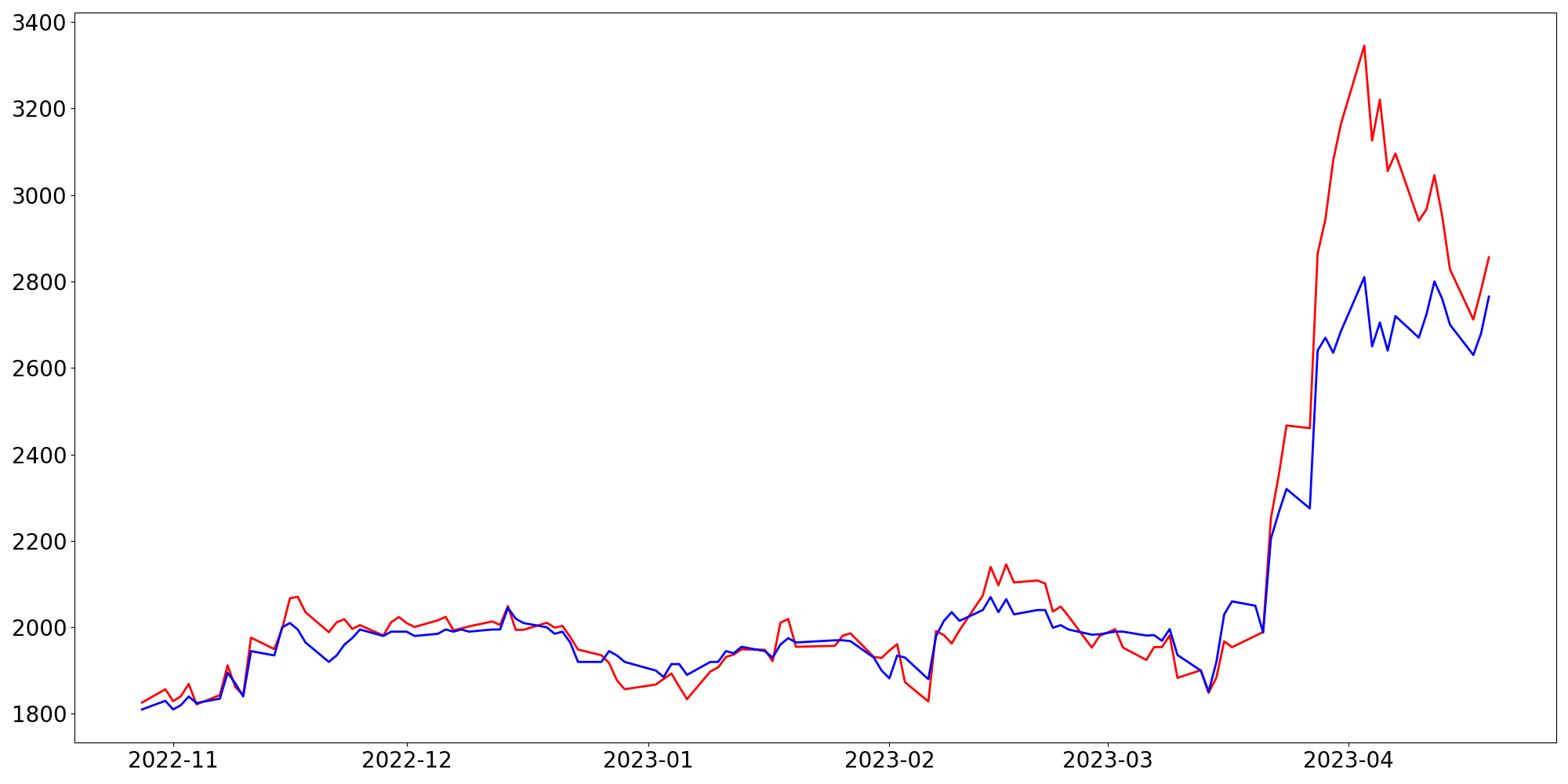 [ - : 실제값(종가) / - : 예측값(종가) ]