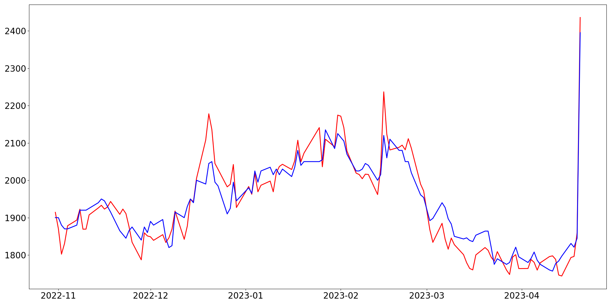 [ - : 실제값(종가) / - : 예측값(종가) ]