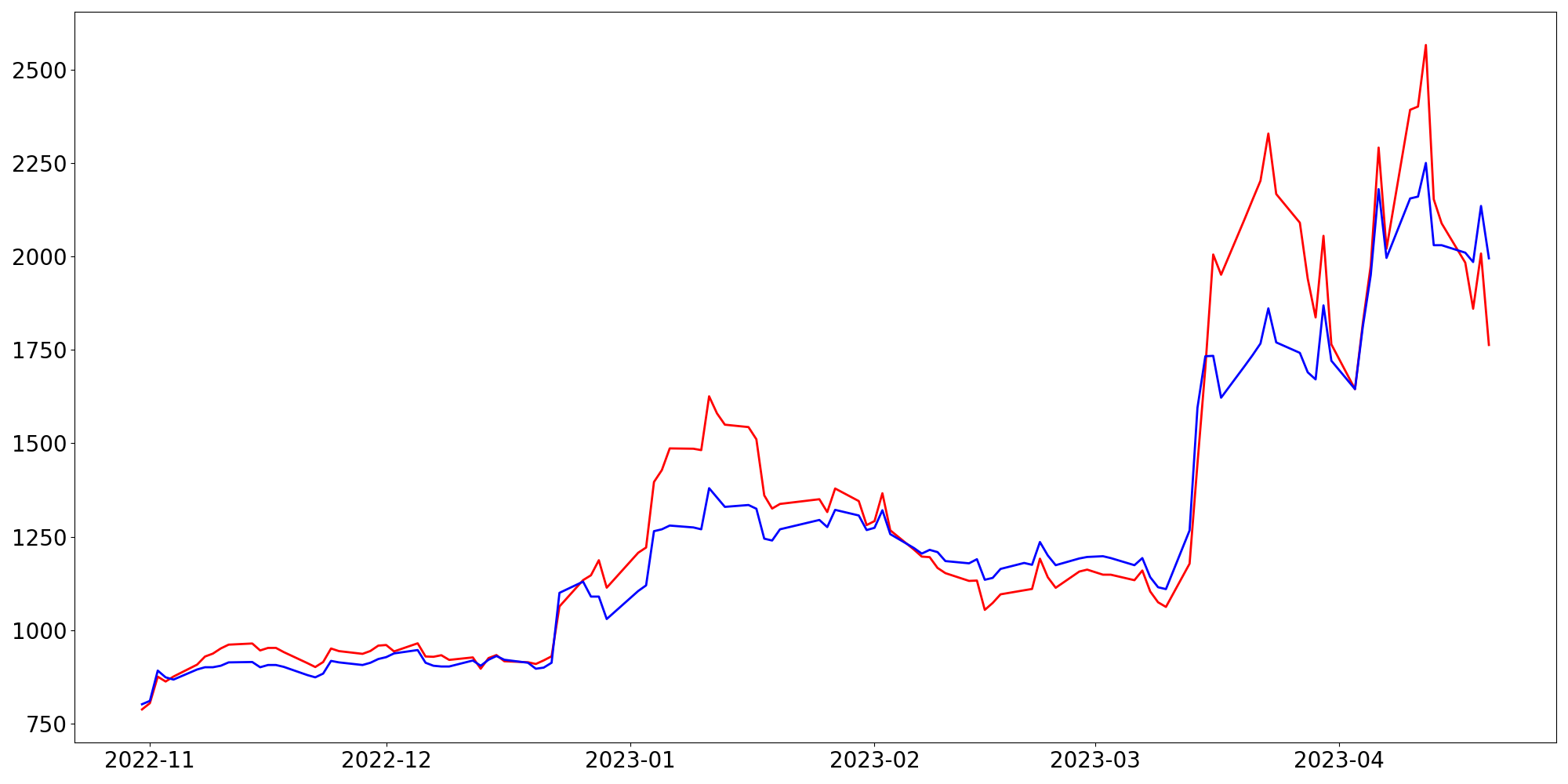 [ - : 실제값(종가) / - : 예측값(종가) ]