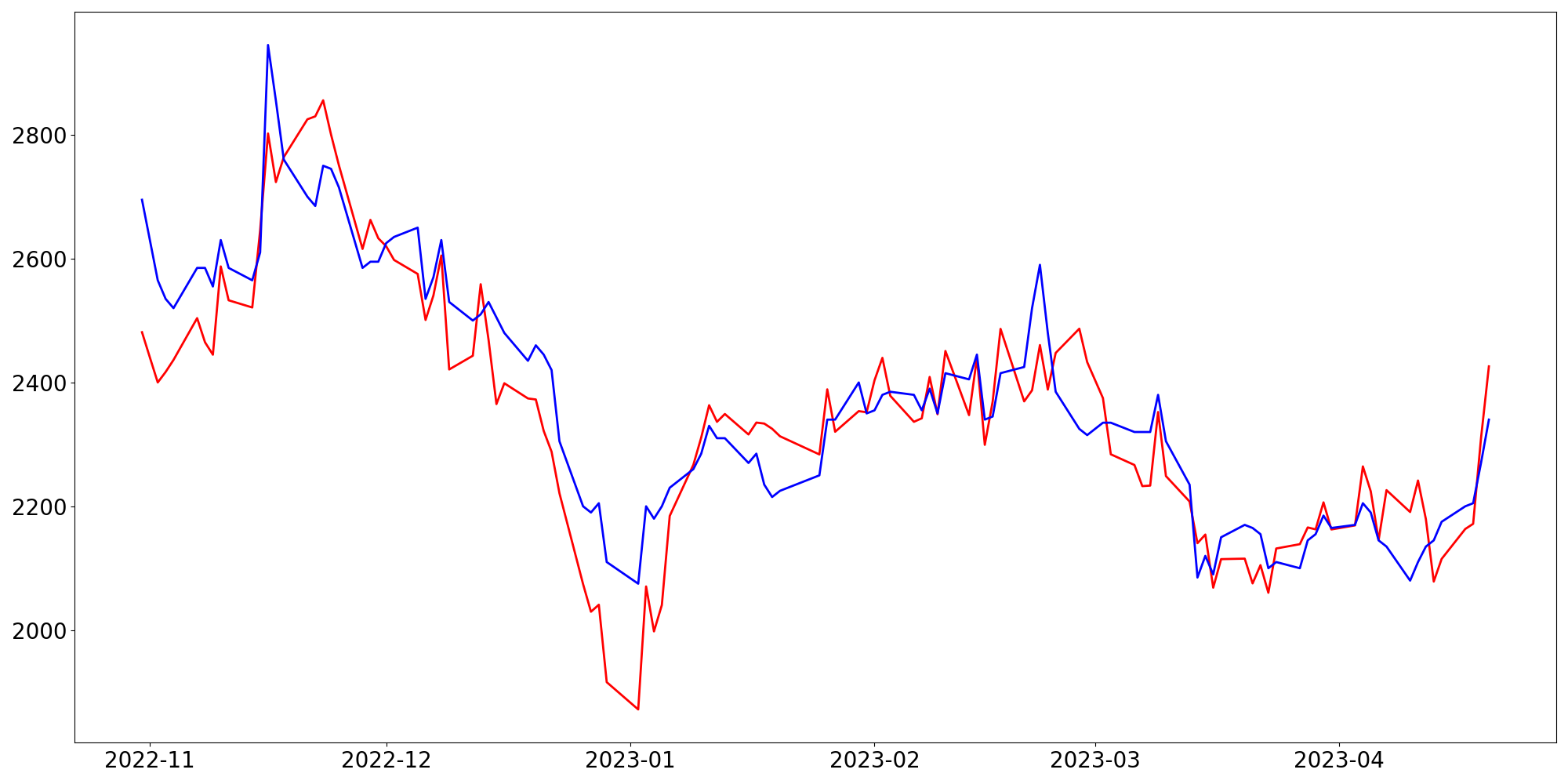 [ - : 실제값(종가) / - : 예측값(종가) ]