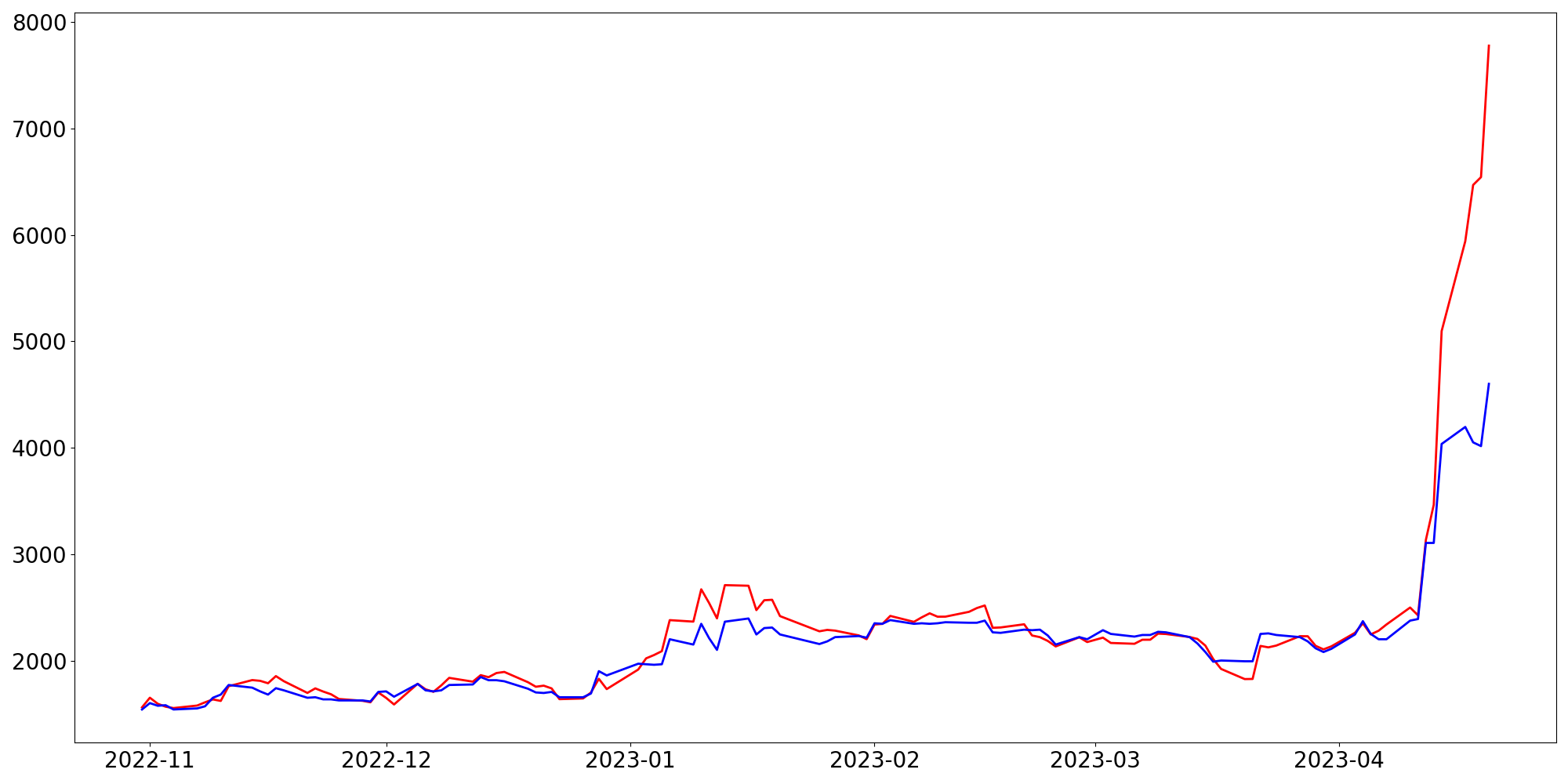 [ - : 실제값(종가) / - : 예측값(종가) ]