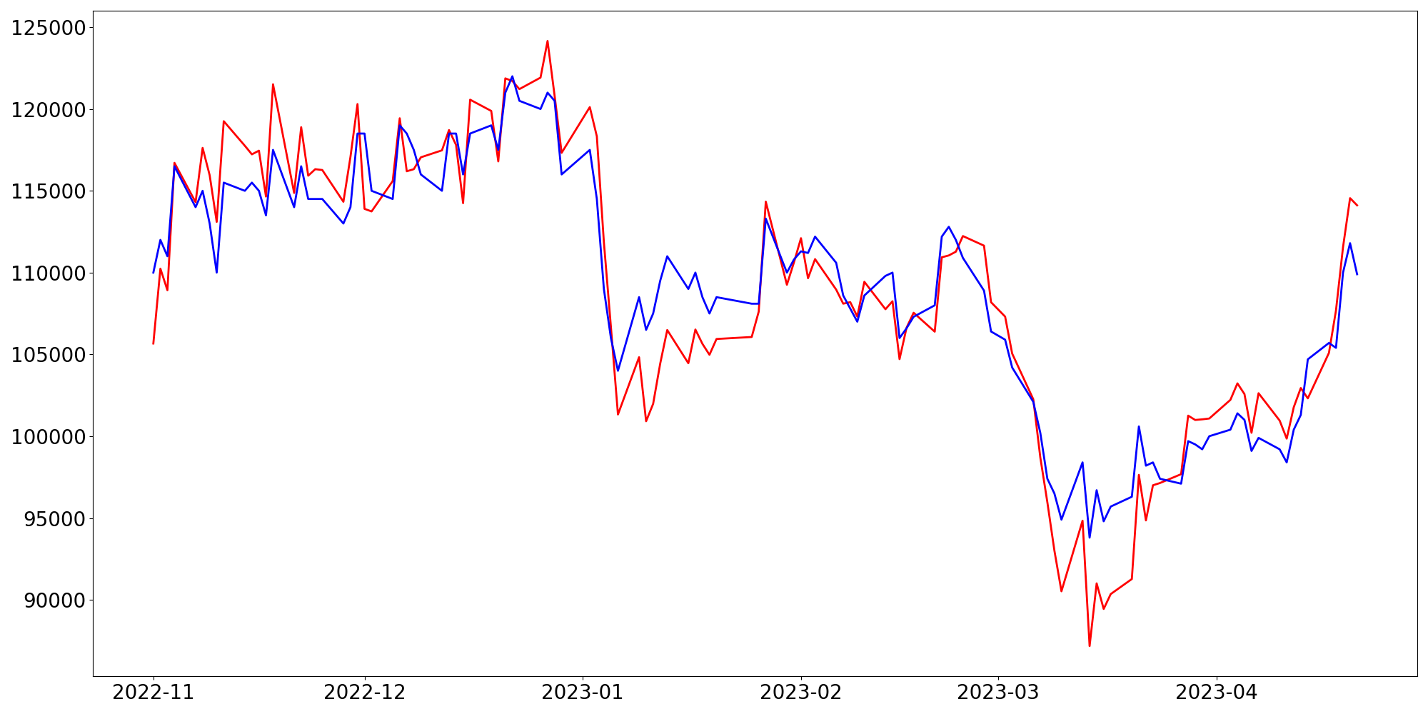 [ - : 실제값(종가) / - : 예측값(종가) ]